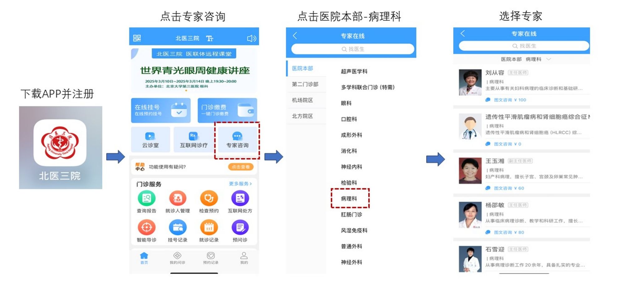 通过北医三院互联网医院平台,患者可以轻松获取病理科的专家咨询服务。您无需再往返医院排队等待,只需在家中打开手机或电脑,登录北医三院APP,选择首页专家咨询-病理科-医师,即可进行报告咨询。我们的病理医师会在规定时间内进行报告咨询结果发送至您的个人账户,让您随时随地查看内容。