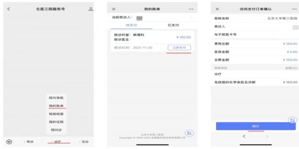 三、北医三院病理科收发室工作人员在收到上述资料后,将为患者办理特需会诊手续,随后会有专人电话通知患者在手机端支付会诊费。收到支付通知后,请按照如下步骤完成缴费:进入“北医三院服务号”,点击“诊疗”—“我的账单”。进入“待支付”界面,点击“立即支付”—“确定”完成支付。患者完成支付后,请通过电话通知北医三院病理科收发室人员,正式启动会诊流程。