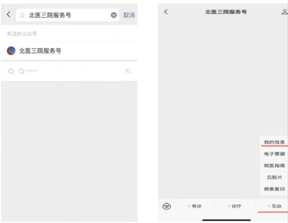 一、患者(必须是患者本人的信息,不能用其他人的信息替代办理就医卡)在手机端办理北医三院电子就医卡:打开微信,关注“北医三院服务号”。点击“互动”—“我的信息”,填写个人信息,注册完成电子就医卡(此时尚无法缴费,待完成步骤二后会有专人电话通知,完成远程缴费)。