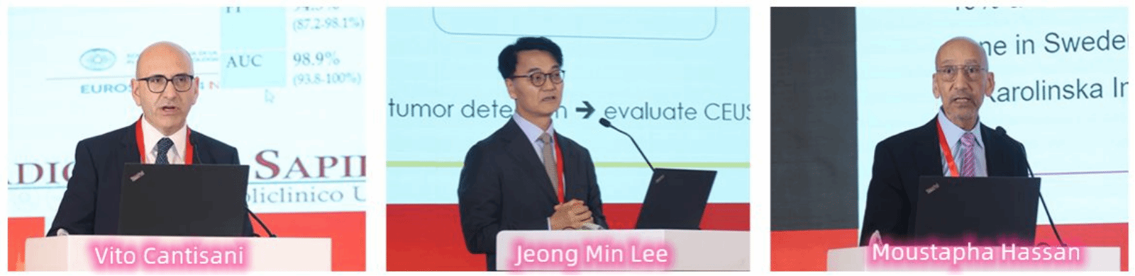 会议期间,国内外权威专家分享领域内前沿进展。来自意大利的Vito Cantisani教授、美国的刘吉斌教授、瑞典的Moustapha Hassan教授、法国的Jacques Souquet教授和韩国的Jeong Min Lee教授,分别就超声造影在肾脏病变诊断中的临床应用、治疗性超声的临床转化、纳米颗粒肿瘤诊疗技术等内容进行专题报告。