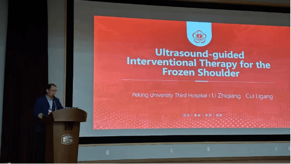 崔立刚在大会主论坛发表了题为《肩关节超声:基础与进阶》的专题演讲,系统阐释了肩关节超声规范化扫查技术与临床实践要点;北医三院李志强则聚焦临床应用,分享了《超声引导冻结肩介入治疗》的创新经验,结合典型案例展示了超声技术对复杂肩关节疾病诊疗的精准引导价值。