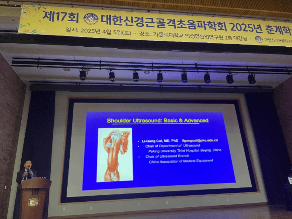 2025年4月4日至5日,第十七届韩国神经肌肉骨骼超声波学学术大会在首尔成功举办。本次会议吸引了韩国及国际超声医学、运动康复领域的顶尖专家学者参会。由北京大学第三医院超声医学科崔立刚主任率领的中国专家团队受邀出席,并在大会上展示了中国肌骨超声领域的成果。