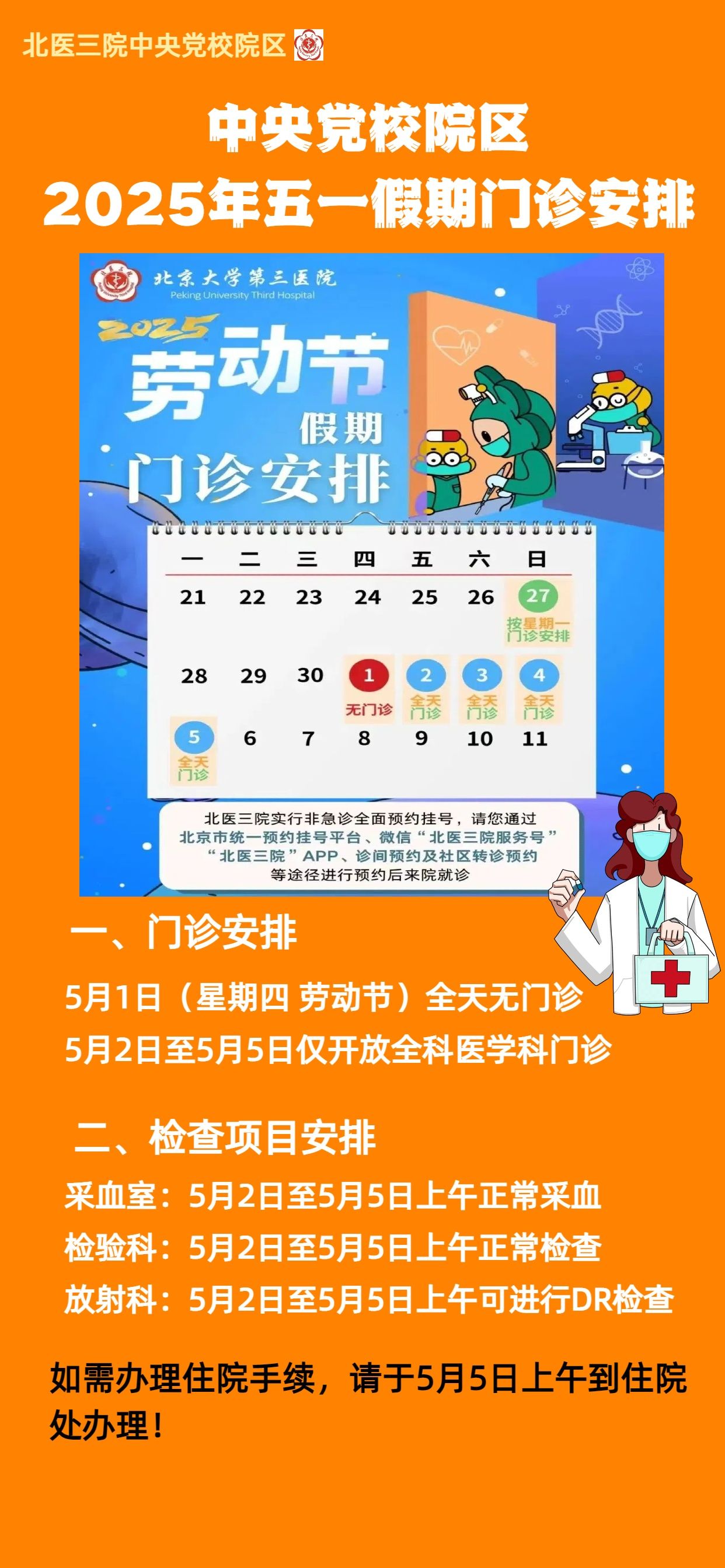 北医三院中央党校院区2025年五一假期门诊安排