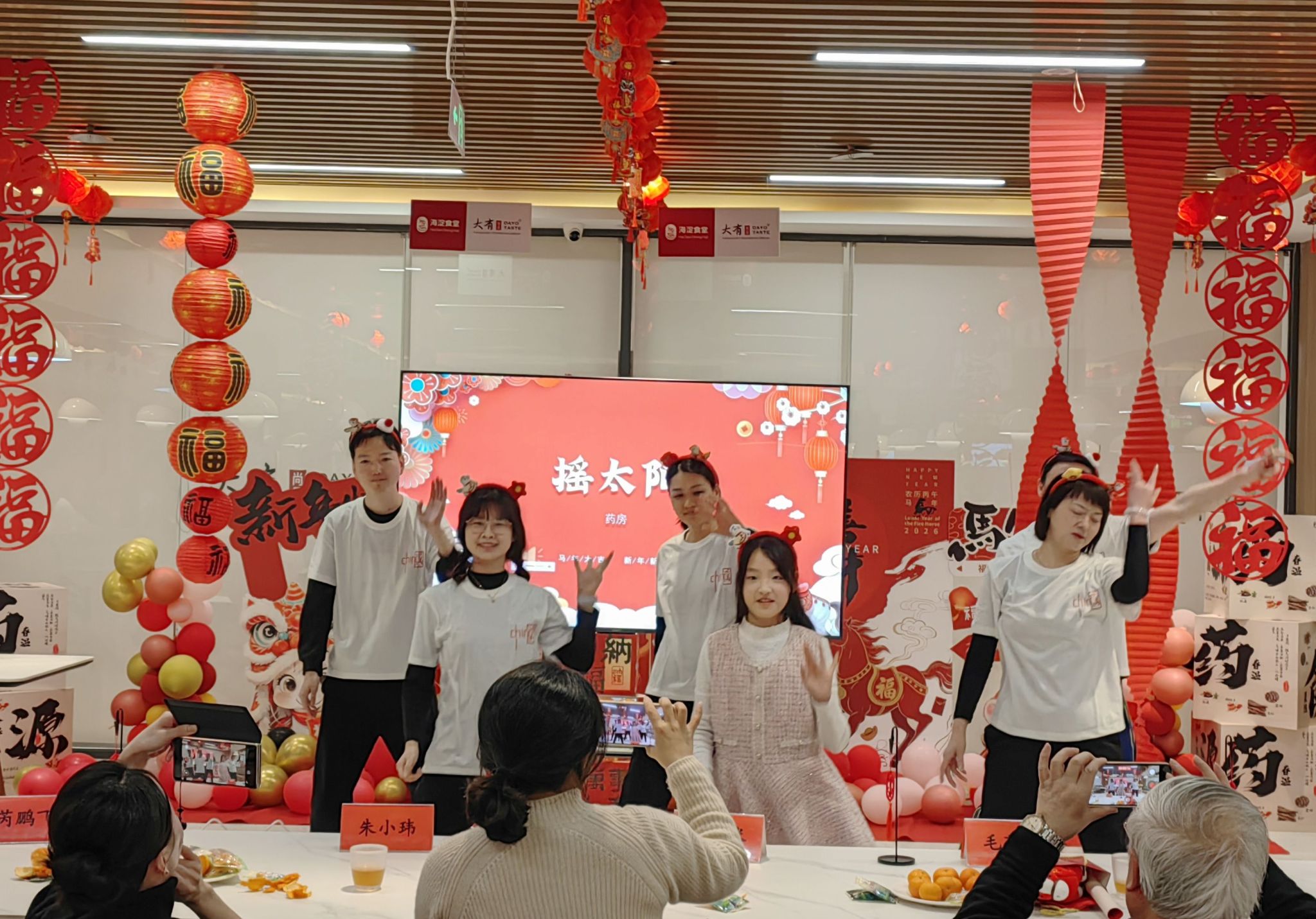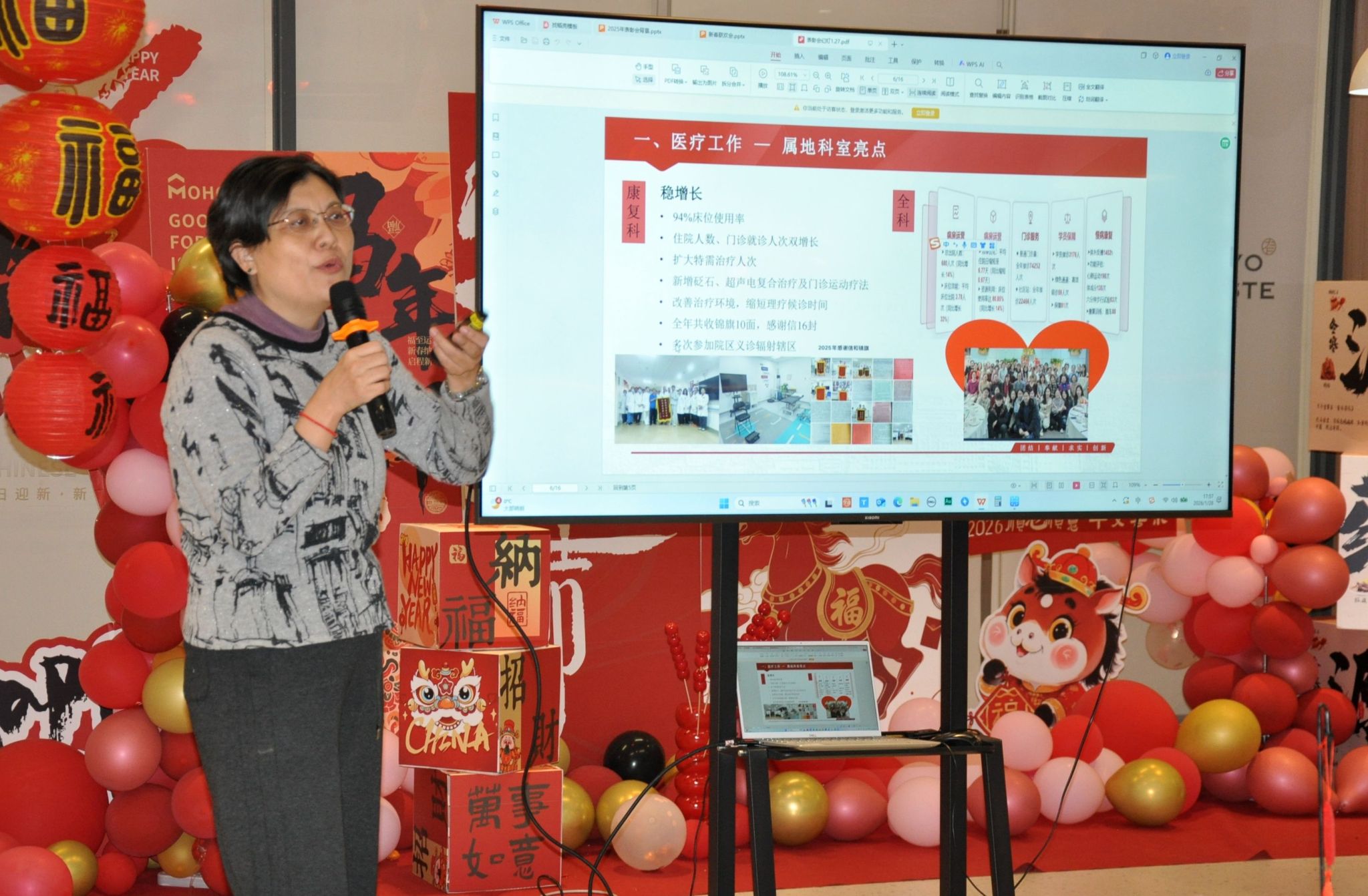 随后,精彩纷呈的新春联谊会在工会组长李丹和迟玉楠的主持下欢乐开启。潘嵩婷小朋友深情朗诵《种在心里的红》,清澈的童声打动人心;药房全体同仁则带来活泼欢快的舞蹈《摇太阳》,自然投入的表演引得满场欢笑;院区护理组的同事们表演舞蹈《我的未来不是梦》,青春欢快的舞步洋溢着护士姐妹们的健康和自信;门诊护理组献上充满活力的舞蹈《这么好看》,俏皮的二次元人偶造型更增添了欢乐气氛。精心设计的互动游戏环节,吸引了大家踊跃参与,现场笑声不断,其乐融融。