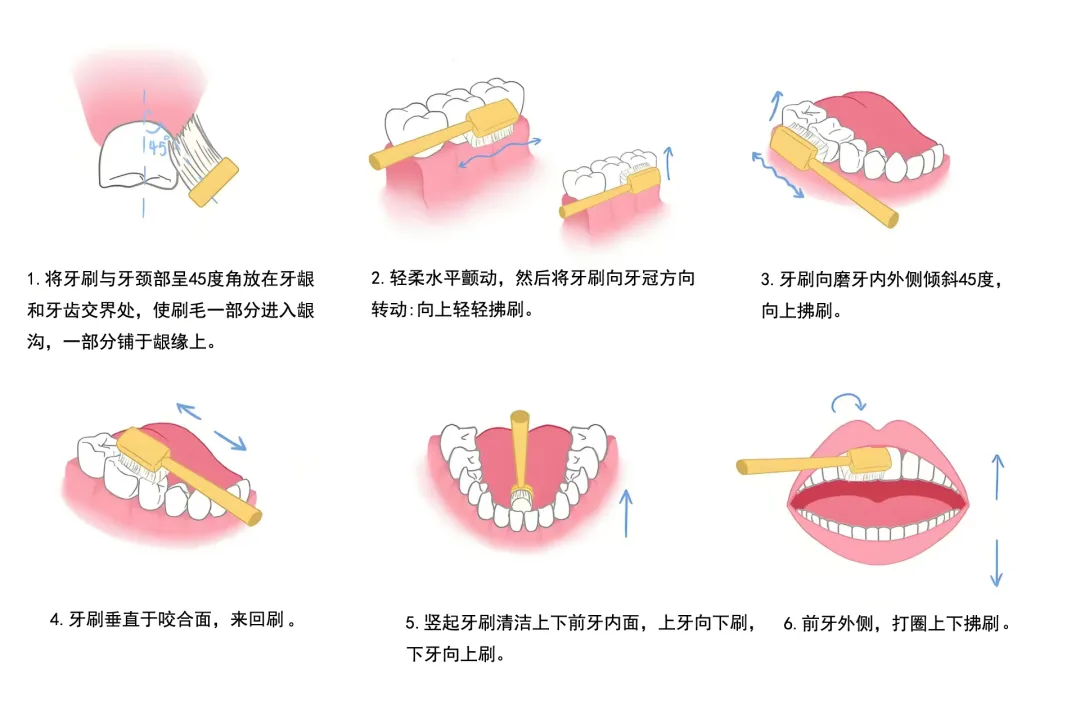 让爱牙成为习惯 一个自信的微笑,一口整洁的牙齿,不仅是我们社交的名片,更是全身健康的标志。然而,蛀牙、牙龈出血等问题,却可能让这份自信大打折扣,同时还会导致心血管疾病、糖尿病、甚至阿尔茨海默病等全身疾病。今天,我们为您准备了一份“牙齿健康生存指南”,希望能帮助您的笑容永远灿烂。常见口腔疾病龋齿(蛀牙):是最常见的口腔疾病之一,主要是由于口腔中的细菌分解食物残渣产生酸性物质,长期侵蚀牙齿表面的珐琅质而形成龋洞。初期可能没有明显症状,但随着病情发展,会出现牙齿疼痛、敏感,吃冷热酸甜食物时尤为明显。牙周疾病:包括牙龈炎和牙周炎。牙龈炎主要表现为牙龈红肿、出血,刷牙或咬硬物时容易出血。如果牙龈炎得不到及时治疗,炎症会进一步向深层组织发展,形成牙周炎。牙周炎会导致牙槽骨吸收、牙周袋形成、牙齿松动甚至脱落。牙周疾病不仅影响口腔健康,还会影响咀嚼功能和美观。日常护理一、正确刷牙“巴氏刷牙法”下图:每次刷牙≥2分钟,早晚各1次。二、清洁邻面每天至少用1次牙线或牙缝刷,预防邻面龋齿和牙周问题。三、控制饮食减少甜食、碳酸饮料的摄入; 饭后漱口,及时清除口腔内残留食物。四、定期检查每6~12个月做1次口腔检查和洁治,及时发现龋齿、牙周炎等问题。爱牙误区 { 刷牙越用力越干净? } 用力刷牙会磨损牙齿表面的牙釉质(不可再生),还可能损伤牙龈导致出血、萎缩,反而降低牙齿的抗龋能力。正确方式是用轻柔力度,通过“巴氏刷牙法”的旋转动作清洁。 { 饭后立刻刷牙? } 进食酸性食物(如柠檬、可乐、醋)后,牙釉质会暂时软化,此时刷牙会加速牙釉质磨损。建议饭后先用清水漱口,等待30分钟后再刷牙。 { 洗牙损伤牙齿、牙缝变大? } 洗牙的核心是清除牙齿表面的牙结石(细菌代谢产物,刷牙无法去除),不会损伤牙釉质。“牙缝变大”是因为牙结石原本堵塞了牙缝,清除后恢复了牙齿的真实间隙,反而有利于口腔健康。记住,呵护口腔健康,就是呵护我们的美好生活。希望大家都能拥有一口健康洁白的牙齿,绽放自信灿烂的笑容!党校院区口腔科出诊时间周一至周四全天END作者:郝秀卿审核人:张雯、赵东芳