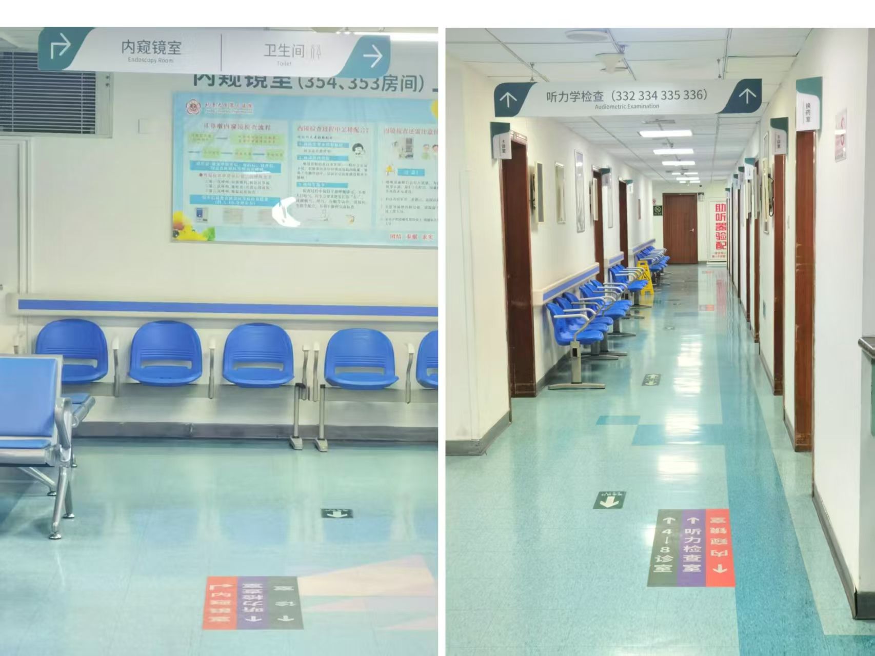 各类检查地点标识清晰,地面与半空(悬挂及墙面)双重指引,同时还有分诊台的专业人员帮助患者指引,化解因寻找地点带来的焦虑。
