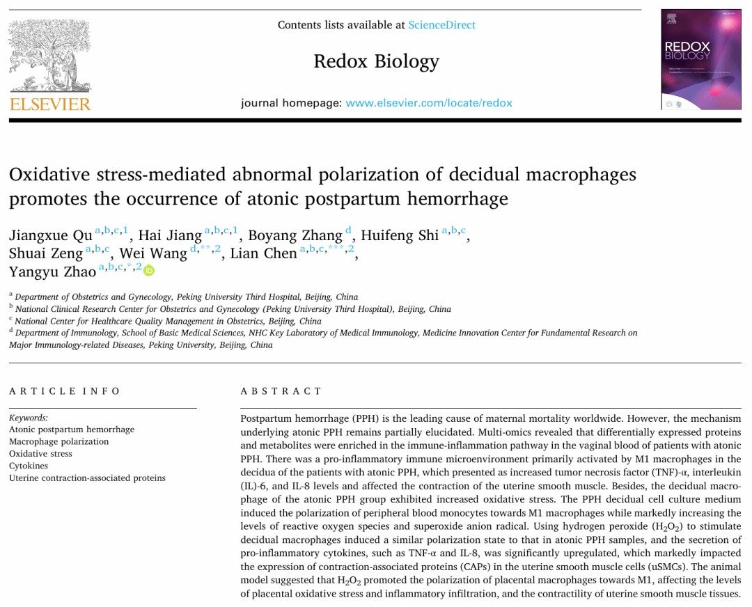 The research team of Zhao Yangyu/Wang Wei from Peking University Third Hospital publishes new findings on the mechanism of postpartum hemorrhage due to uterine atony in Redox Biology