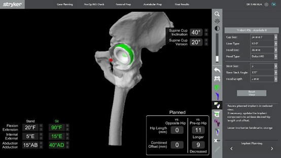 在Total Hip 4.0全流程模式辅助下,田华教授为患者选择了合适的假体型号,并进行了假体精准安放,在不同体位下模拟了髋关节的各向运动,避免了撞击,获得了非常满意的髋关节活动度和稳定性。手术仅用时40余分钟,出血量不足100ml。