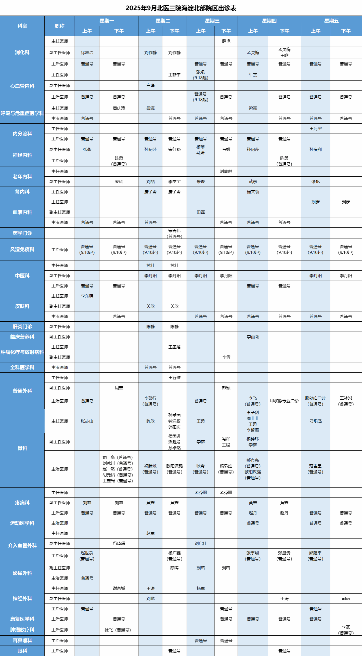 2025年9月北京大学第三医院海淀北部院区出诊安排