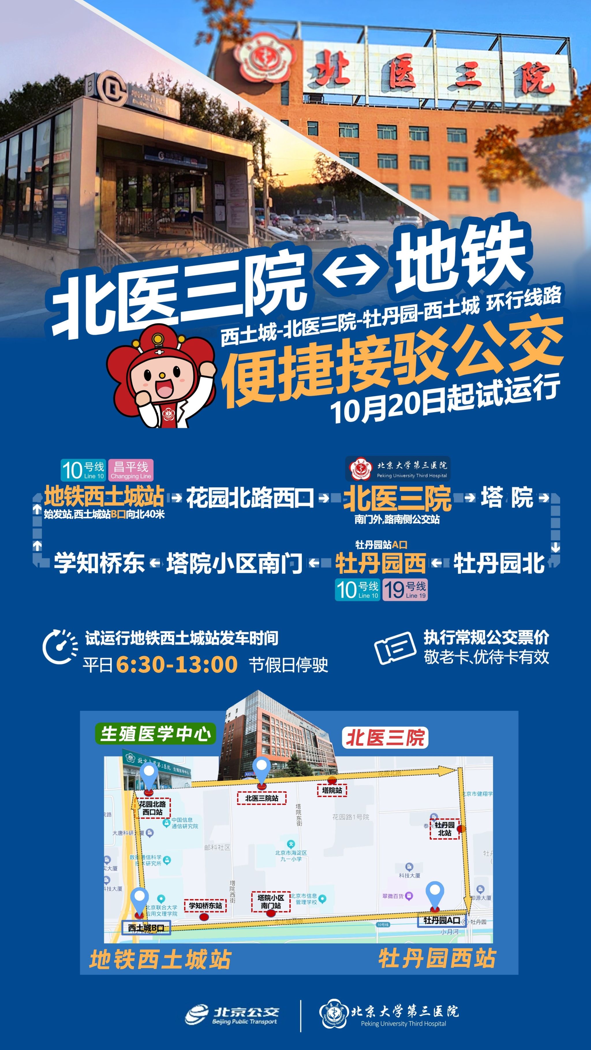 该线路已接驳 [地铁西土城站B口](北侧约40米新设公交专线站牌)和[地铁牡丹园站A口],经由沿途公交站点,乘坐该公交专线可抵达[北医三院生殖中心]和[本部院区]。欢迎广大就医患者选乘公共交通,绿色出行。