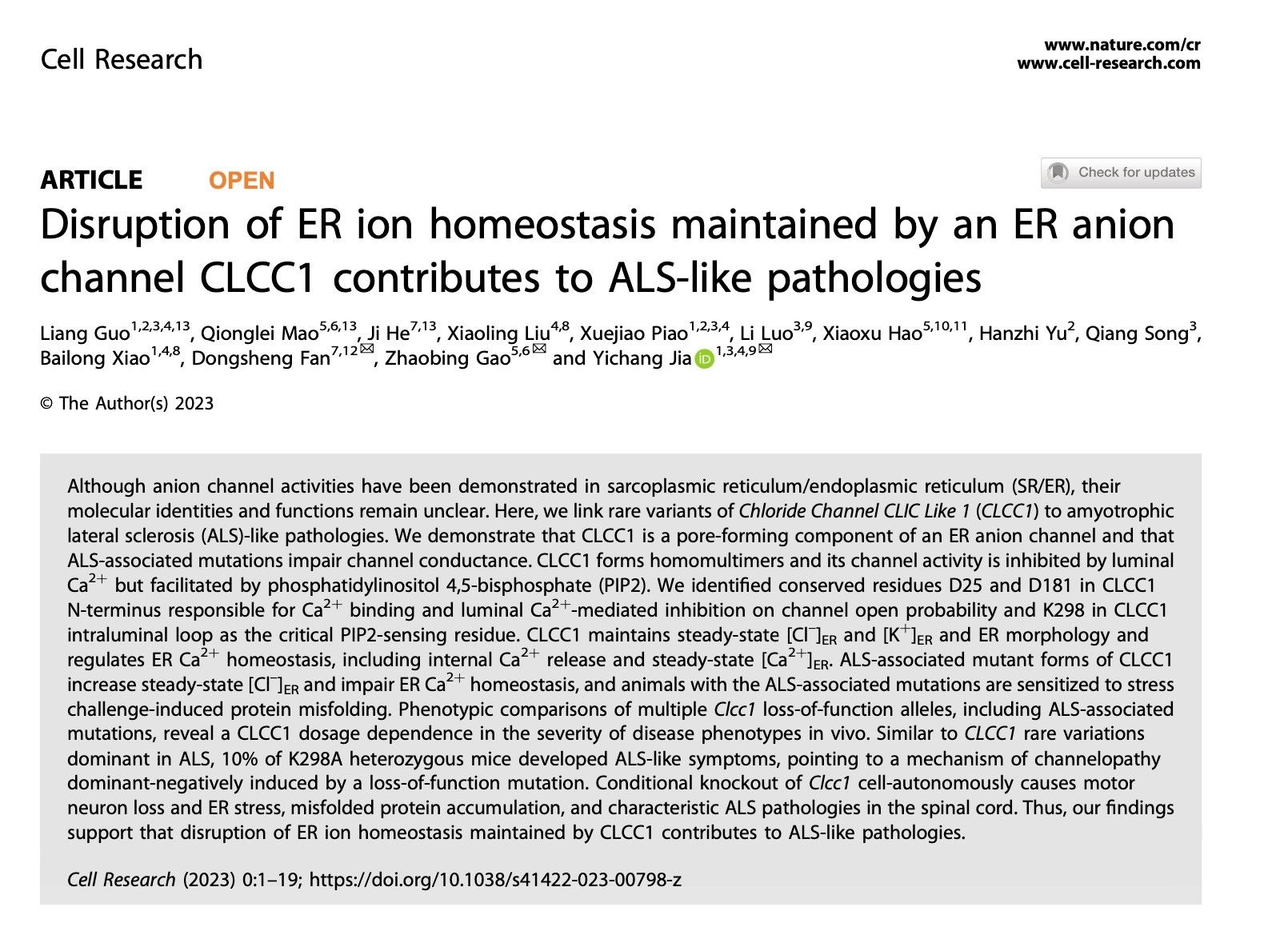 近日,北京大学第三医院神经内科樊东升教授、中科院药物所高召兵教授、清华大学医学院贾怡昌教授联合研究团队,在国际高水平期刊、Nature杂志子刊Cell Research在线发表封面(2023第七期)文章,题目为《内质网阴离子通道维持的离子稳态破坏导致肌萎缩侧索硬化病理改变》(‘Disruption of ER ion homeostasis maintained by an ER anion channel CLCC1 contributes to ALS-like pathologies’)的研究成果。