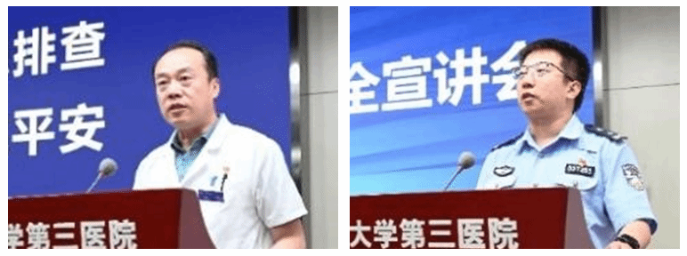 医院党政领导高度重视本次会议工作,党委书记金昌晓、院长付卫、副院长宋纯理及“平安医院”工作小组和全院科室责任人、安全员近500人参加了培训会。会议邀请了北京市公安局海淀分局花园路派出所副所长、北医三院警务室负责人徐振参加。