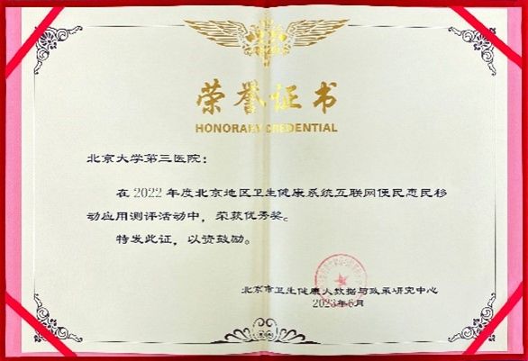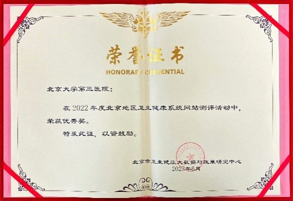 2023年6月29日,北京市卫生健康委组织召开了2022年度北京地区卫生健康系统网站和移动应用测评工作总结暨部署动员会。我院网站以106分成绩排名北京市医疗机构第一,荣获“优秀网站奖”;移动应用以102分成绩排名北京市医疗机构第二,荣获“互联网便民惠民移动应用优秀奖”。