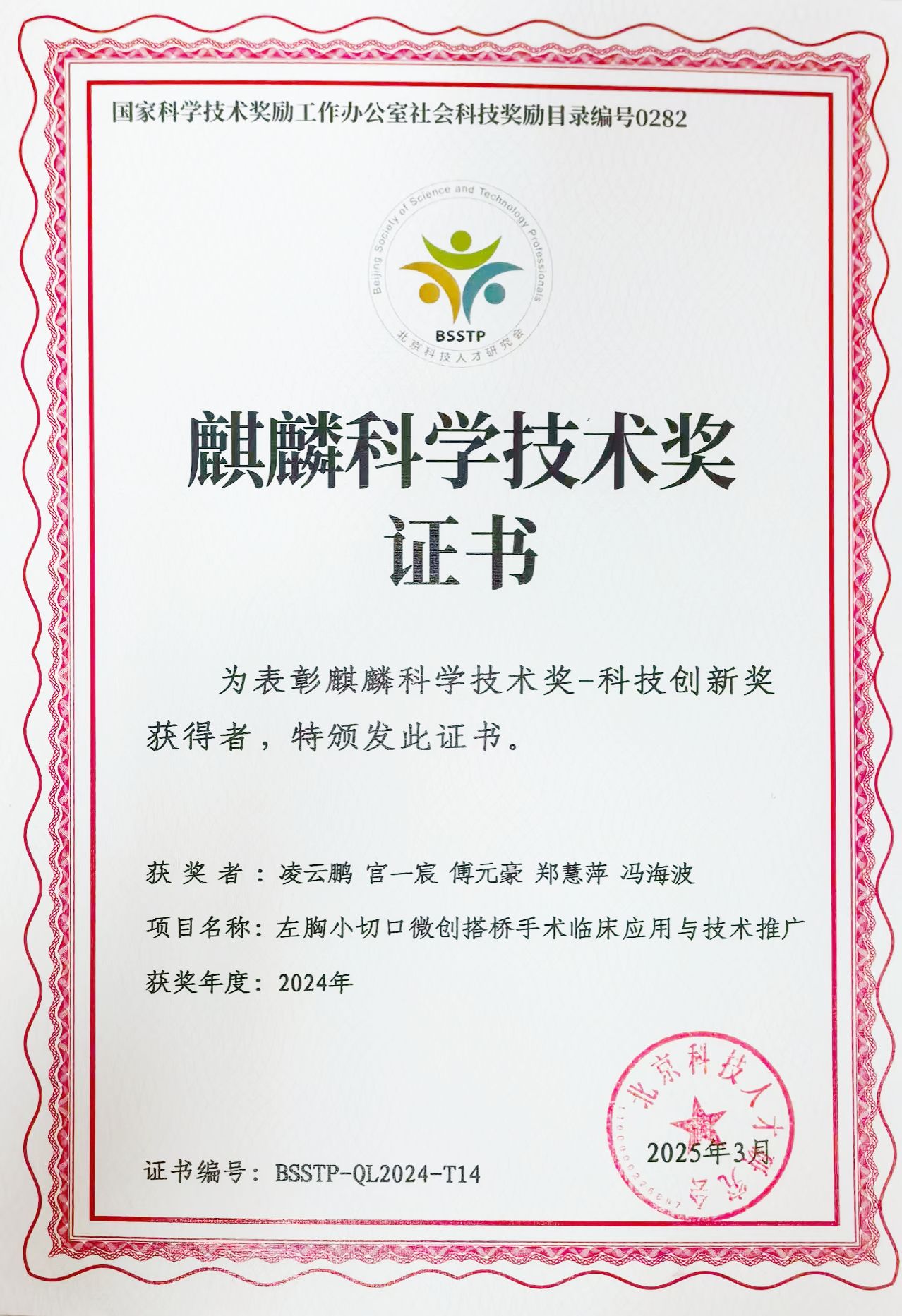 2025年7月12日,北京科技人才研究会在麒麟科技创新论坛国际会议上举行“麒麟科学技术奖”颁奖仪式。北医三院心脏外科凌云鹏教授团队的“左胸小切口微创冠脉搭桥手术临床应用与技术推广”项目和眼科李学民教授团队的“动态视功能检测训练平台”项目荣获麒麟科学技术奖-科技创新奖。