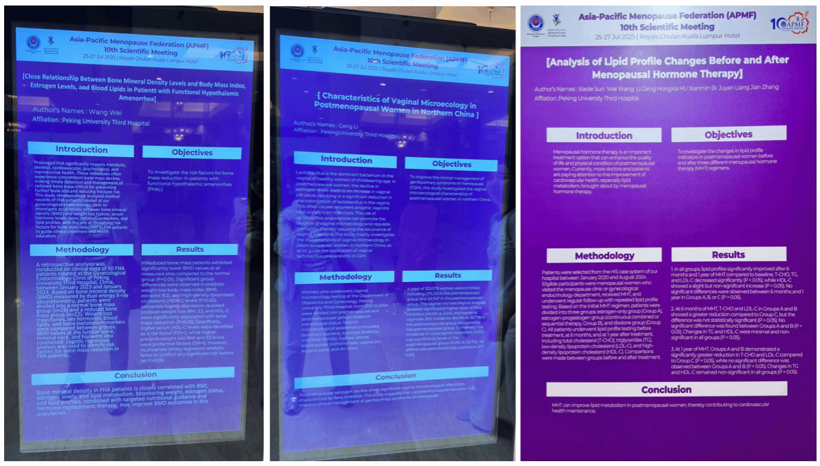 2025年7月25日至27日,亚太更年期联合会(APMF)第10次学术会议在马来西亚首都吉隆坡举行。本次会议以“多学科创新革新妇女健康”为主题,汇聚了来自亚太地区及全球范围内妇产、内分泌、老年医学等领域的专家,共同深入探讨更年期管理与女性健康领域的最新研究进展和未来发展方向。我院妇科内分泌团队耿力等3人参会。
