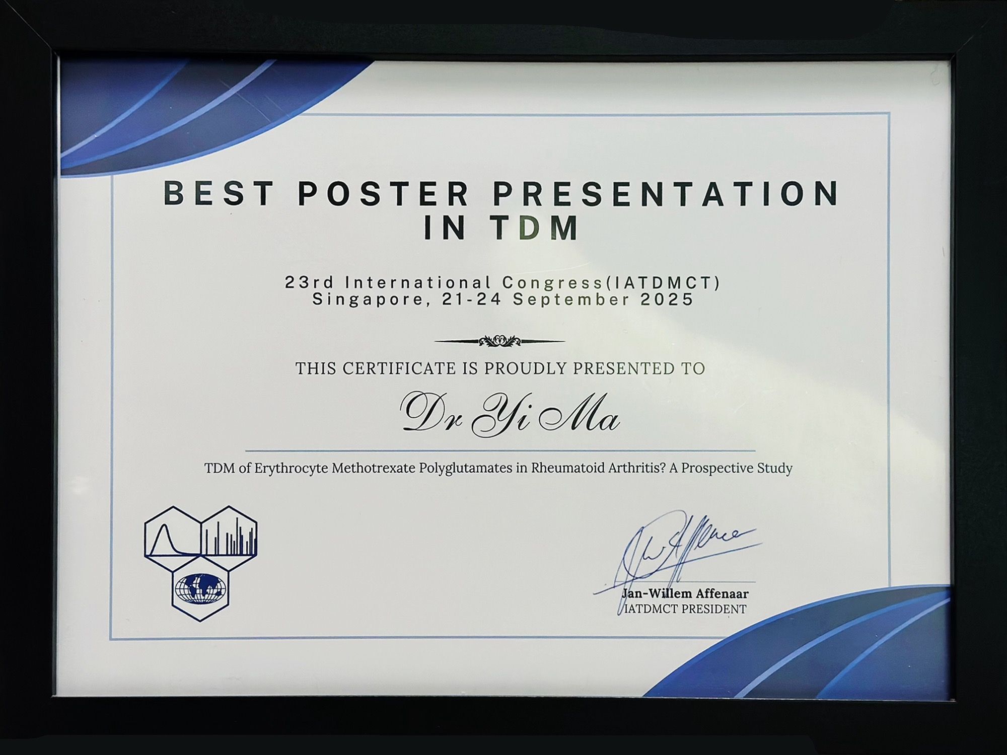 在壁报演讲报告环节,马毅主管药师以“基于红细胞内多聚谷氨酸化甲氨蝶呤的类风湿关节炎患者治疗药物监测初探:一项前瞻性队列研究”为题作报告,并获本届大会唯一的“TDM最佳壁报报告奖”。 该研究基于前瞻性队列,探讨了红细胞内多聚谷氨酸化甲氨蝶呤在临床TDM中的应用潜力。研究结果为低剂量甲氨蝶呤的精准应用提供了新证据,有望助力类风湿关节炎患者的个体化用药。