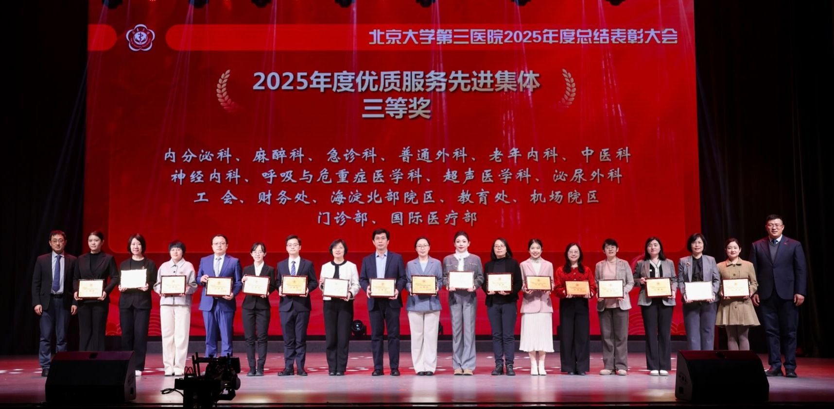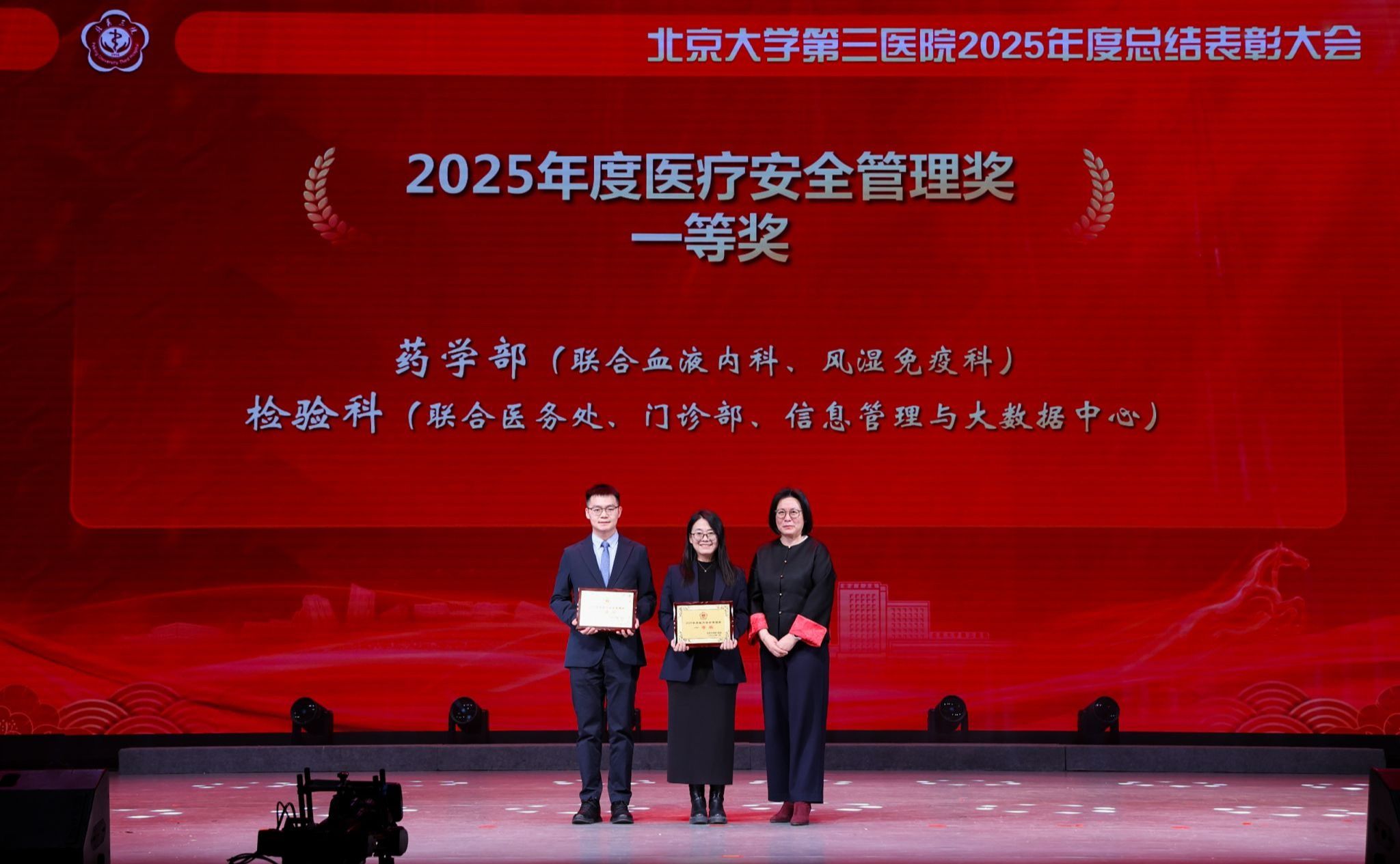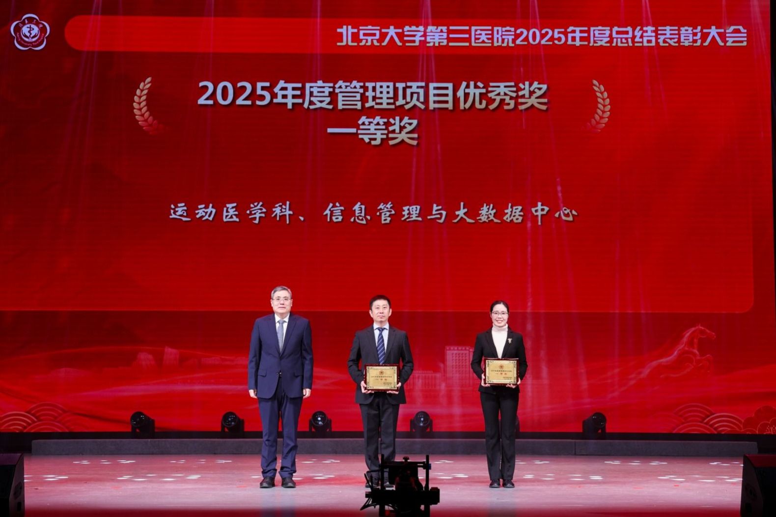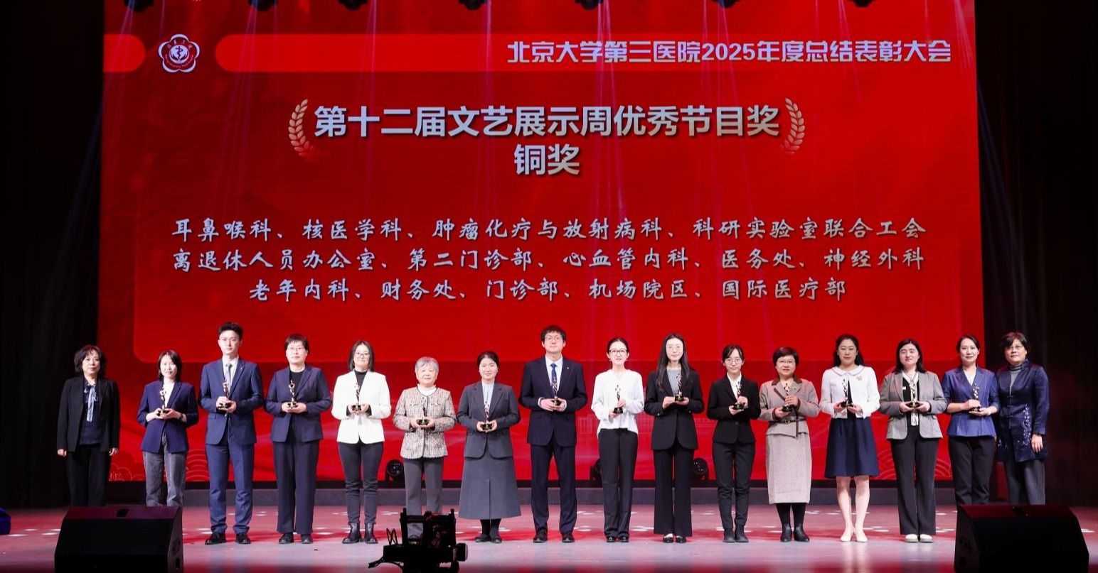银蛇摆尾辞旧岁,金马扬蹄踏春来。2026年1月16日下午,北京大学第三医院2025年度总结表彰大会在北京大学医学部会议中心礼堂召开。北京大学医学部主任、中国工程院院士乔杰,北京大学工会常务副主席张宝岭,北京大学医学部副主任王嘉东、唐熠达,医学部党委副书记、工会主席朱树梅,花园路街道党工委书记赵志辉,海淀区市场监管局党组书记、局长聂俊杰,花园路街道办副主任王进等领导和嘉宾莅临。