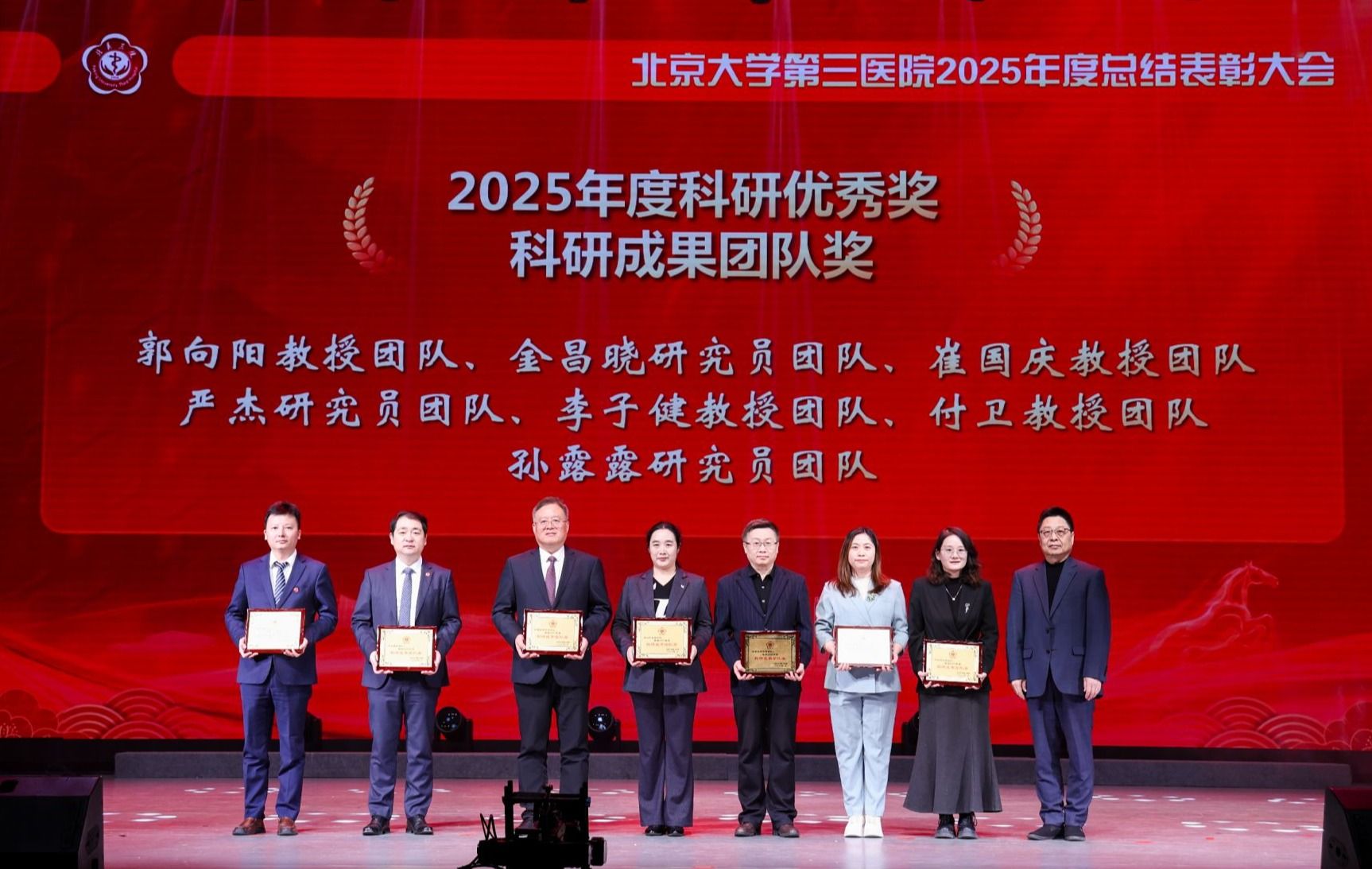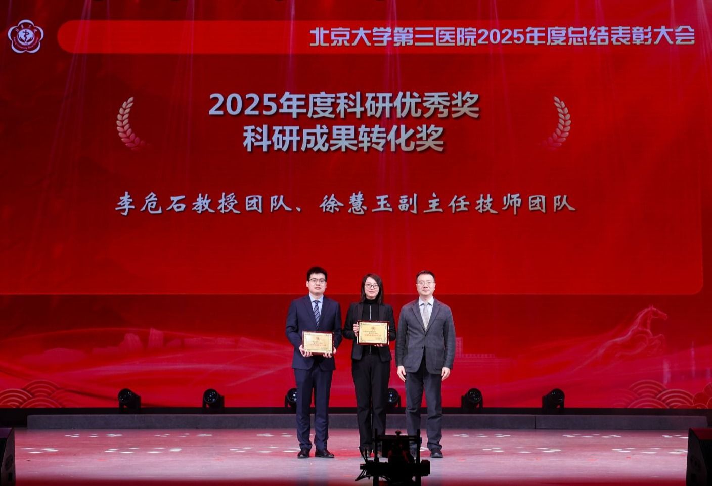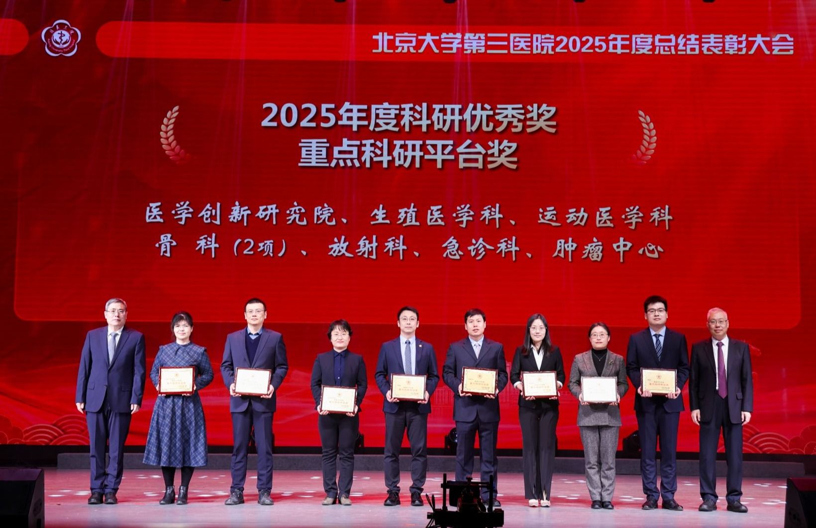 北医三院坚持面向世界科技前沿、面向国家重大需求、面向人民生命健康,建设研究型医院,进行医学科技创新,发展新质生产力。医院强化有组织科研,推动医教研产深度融合,集中力量攻坚关键核心技术,加速推动原创性、引领性科研成果的产出与转化,致力于让科技创新转化为提升诊疗水平、惠及患者的“最大增量”。医学创新研究院、生殖医学科等获得重点科研平台奖;郭向阳教授团队等获得科研成果团队奖;李蓉教授团队等项目获得重大项目奖;乔杰院士团队等成果获得高水平科研成果奖;李危石教授团队、徐慧玉副主任技师团队获得科研成果转化奖;王媛媛研究员、袁鹏副研究员、卢永杰副研究员等获得优秀人才奖。方毅为等获得优秀青苗奖。