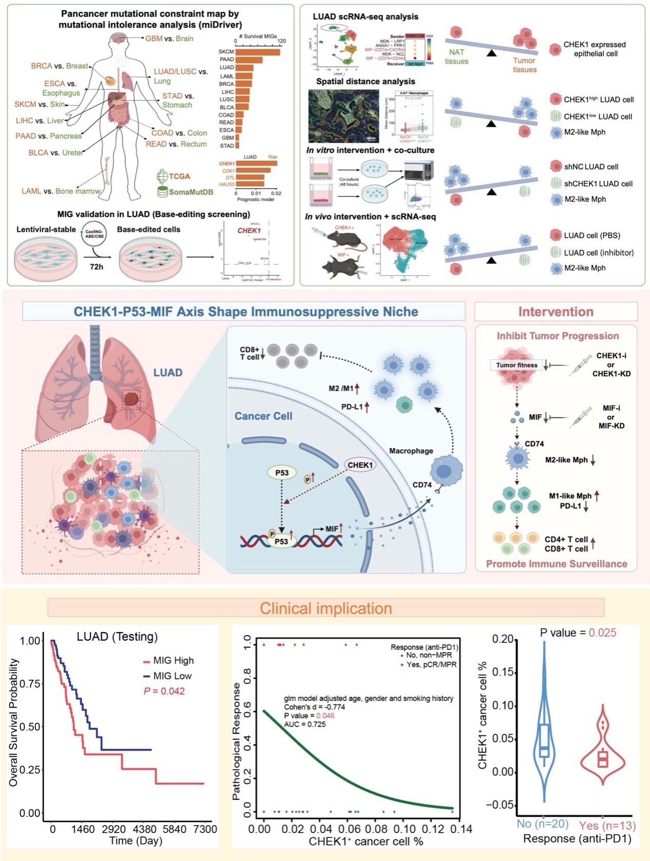 通过整合分析泛癌基因组、单细胞转录组以及CRISPR筛选技术,研究证实了MIGs维持肿瘤生长的双重机制。首先是细胞内在的生存保障:以核心靶点CHEK1为例,研究发现扰动该基因能够诱发合成致死效应,直接导致肺腺癌细胞的增殖受阻。其次是外在微环境的免疫重塑研究揭示了一类具有干细胞特性的CHEK1 high肿瘤细胞亚群。该亚群通过p53-MIF-CD74信号轴,将巨噬细胞转化为保护肿瘤的抑制型(M2型)巨噬细胞。这一发现为部分患者的肿瘤微环境呈现“免疫沙漠”状态提供了新的分子视角。此外,在独立患者队列中的验证显示,CHEK1的高表达能够有效预测患者对anti-PD-1免疫治疗的反应。对于表现为免疫耐药的患者,CHEK1的异常激活可能是导致治疗失效的关键屏障。因此,靶向CHEK1不仅能直接产生抗肿瘤效应,更能作为一种强有力的微环境重塑策略,将冷肿瘤转化为热肿瘤,从而显著提升PD-1抑制剂等免疫检查点阻断疗法的临床响应率。