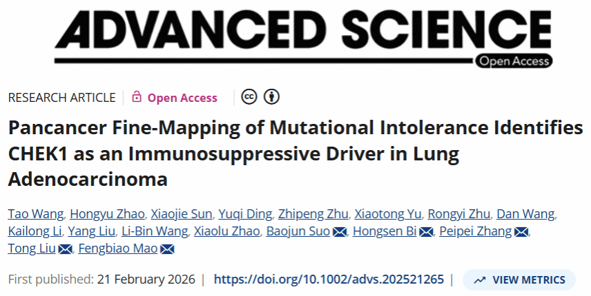 近日,北京大学第三医院基础医学研究中心毛凤彪团队联合刘彤副研究员、成形外科毕洪森主任医师、消化科索宝军副主任医师和北京大学基础医学院张培培副研究员在Advanced Science(《先进科学》IF:14.1)在线发表题为“Pancancer Fine-Mapping of Mutational Intolerance Identifies CHEK1 as an Immunosuppressive Driver in Lung Adenocarcinoma”(泛癌突变不耐受性分析揭示CHEK1是肺腺癌免疫抑制的驱动因子)的研究论文。