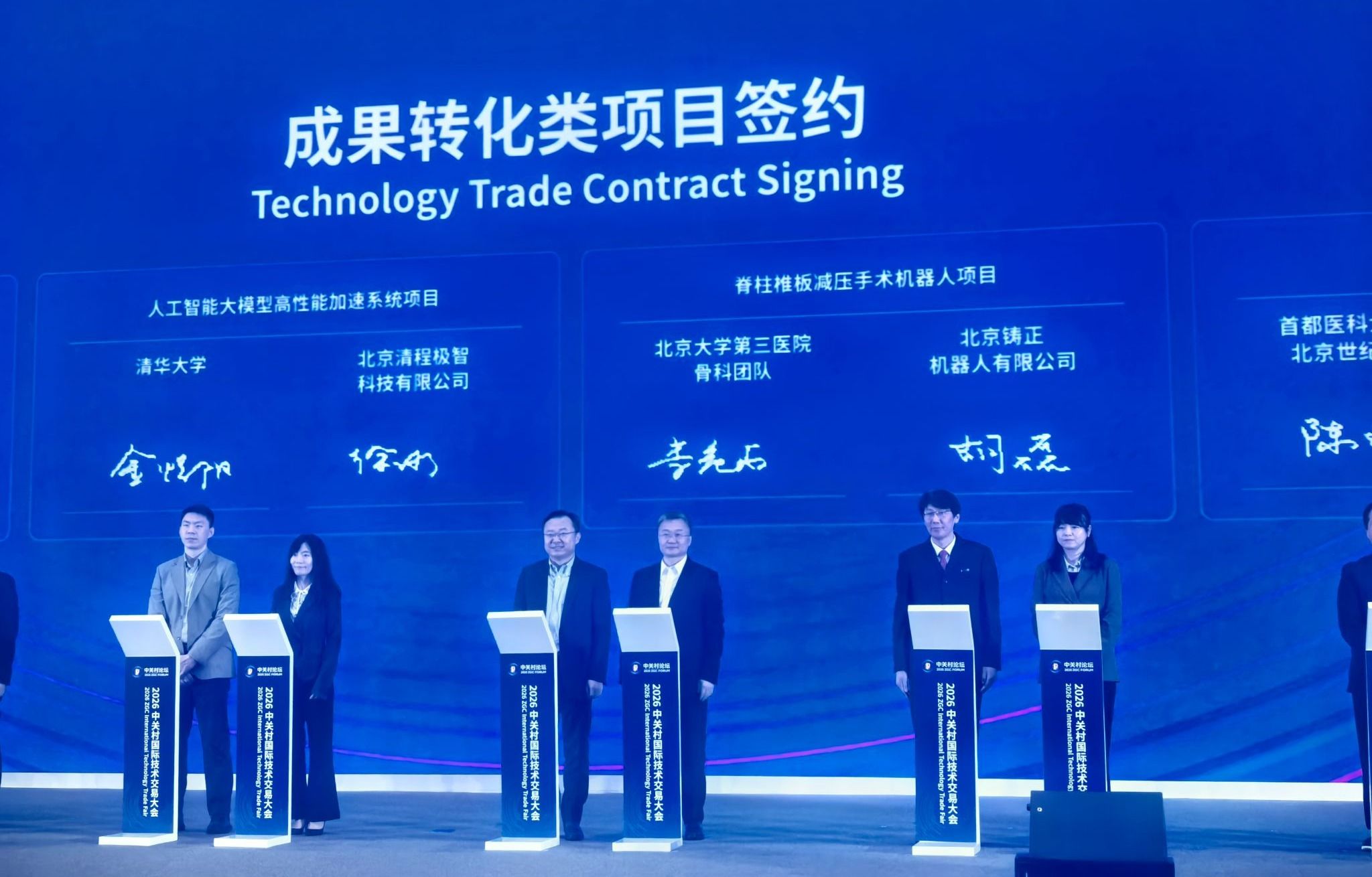 3月25日下午,在2026中关村国际技术交易大会开幕式上,18个项目现场签约,北医三院两个项目入选。成果转化类项目签约现场骨科李危石团队“脊柱椎板减压手术机器人”作为“成果转化类”6个重大项目之一进行签约。生态合作类签约现场生殖医学科严杰团队与百洋医药集团共建的“北医三院-百洋诚创生殖功能修复联合研发中心”作为“生态合作类”6个重大项目之一进行签约。此次签约将加速科研成果转化,推动创新链、产业链、人才链深度融合,加快培育发展新质生产力。