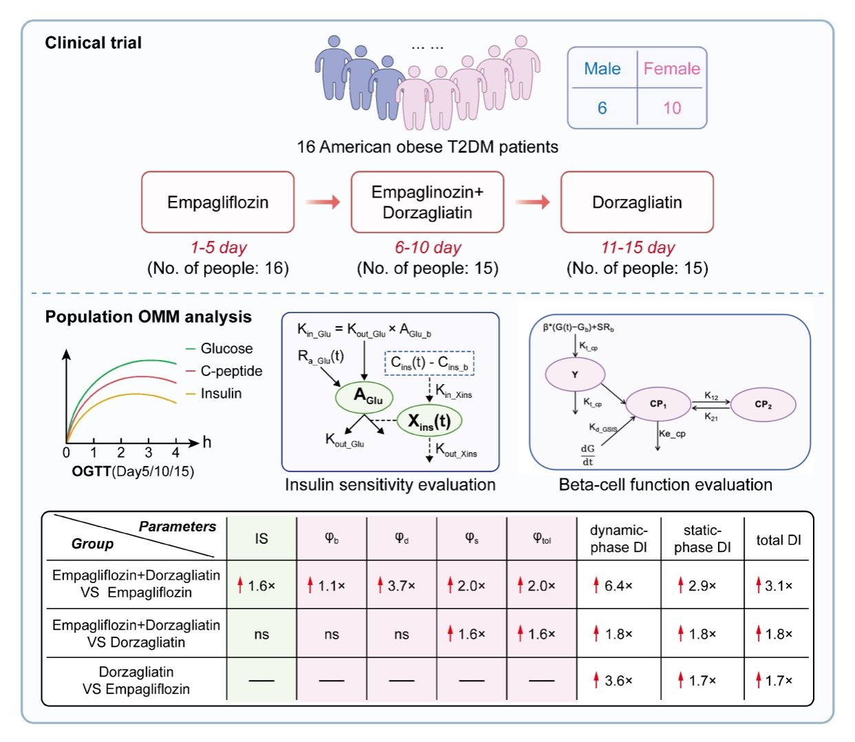 葡萄糖激酶激活剂(GKAs)是一类新型机制的降糖创新药:一方面通过增强胰腺β细胞敏感性来促进葡萄糖刺激的胰岛素分泌,另一方面促进内源性胰高血糖素样肽-1(GLP-1)的释放。多格列艾汀(Dorzagliatin)作为我国首个慢病领域首创新药,其临床研究已证实可显著改善β细胞功能,并在前瞻性随访中使经多格列艾汀控糖良好的患者停药三月后,52%患者实现糖尿病缓解。鉴于GKAs与钠-葡萄糖协同转运蛋白2抑制剂(SGLT2is)的作用机制具有互补性,两药联合预期可产生协同获益,但该联合用药的药代动力学(PK)相互作用、药效学(PD)特征及其安全性尚未得到系统阐明。另外,虽然国外已建立个体数学模型以使用糖耐量试验数据评价糖尿病最核心的两个参数(胰岛素分泌能力和敏感性),但失败率高,耗时长,亟需改进。