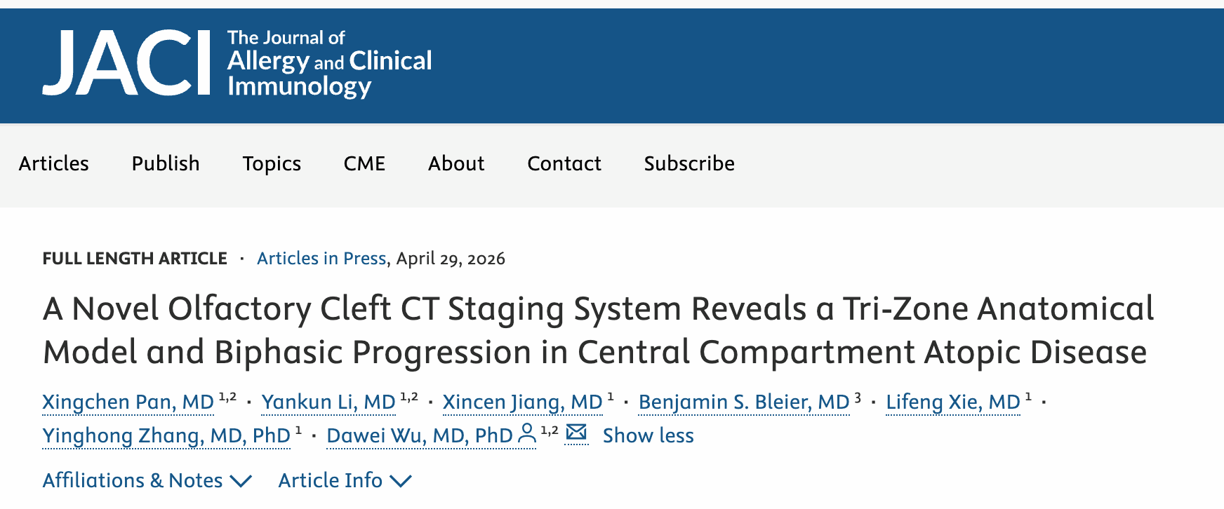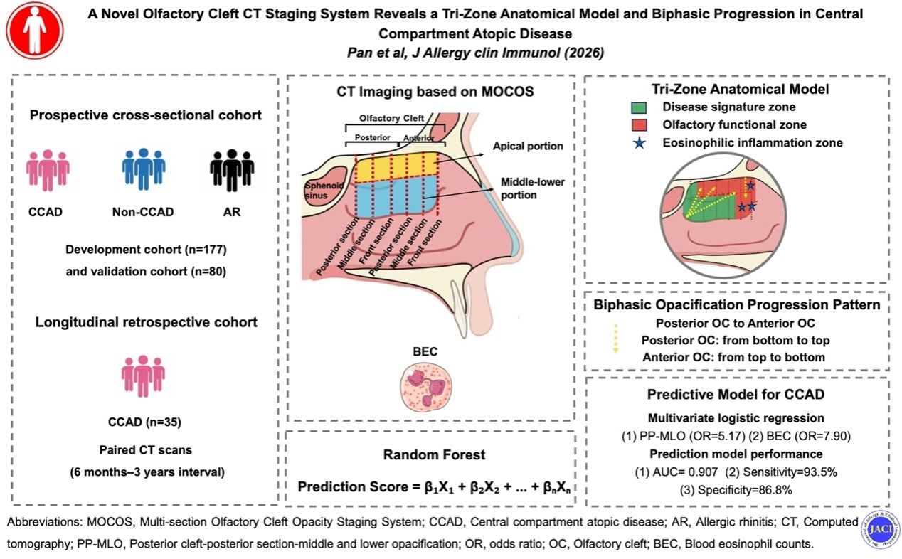 2026年4月29日,北京大学第三医院耳鼻喉科武大伟团队在Journal of Allergy and Clinical Immunology(《过敏和临床免疫学杂志》 IF=11.2)在线发表题为“A Novel Olfactory Cleft CT Staging System Reveals a Tri-Zone Anatomical Model and Biphasic Progression in Central Compartment Atopic Disease”(一种新型嗅裂CT分期系统揭示中央区变应性疾病三区解剖模型及双相进展模式)的研究成果,不仅创立了全新的嗅裂浑浊评估系统,更为难治性鼻窦炎患者嗅觉障碍的“精准施治”提供了清晰的解剖学路线图。