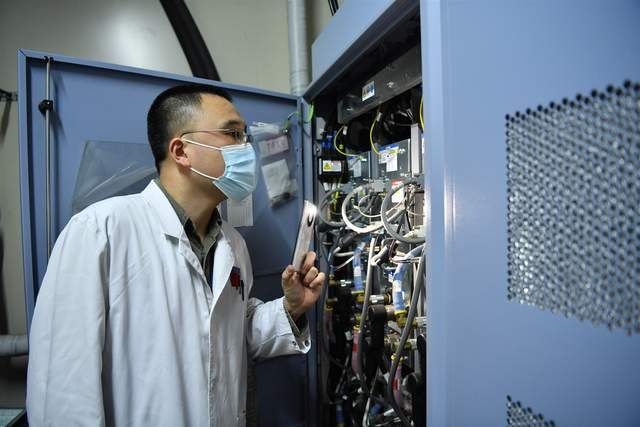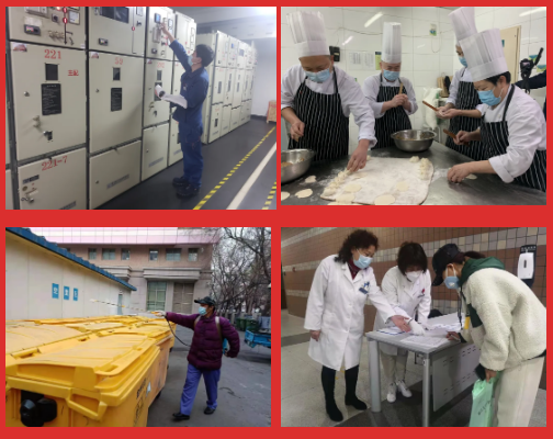 总务处工程师正在巡视和切换液氧设备,保障节日供电安全。总务处探视管理人员正在仔细核对信息。保洁人员一丝不苟地在医院各个角落进行消毒。