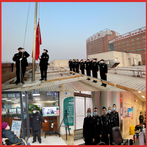 大年三十,国旗缓缓升起,保安兄弟们坚守在自己的工作岗位上,守护平安。