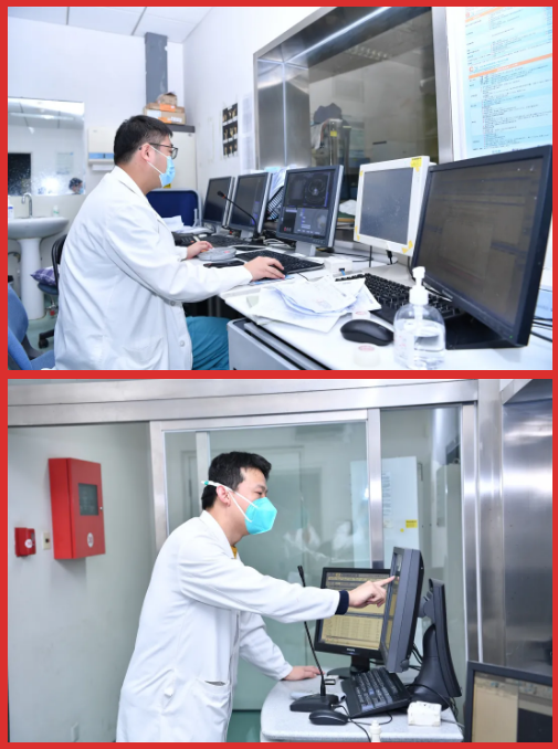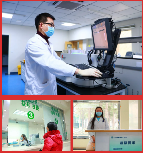 北方院区医护24小时病房楼值岗,保护患者安全。检验科工作人员正在为门诊患者样本检测,收费处窗口除夕不打烊,保证实时结算。