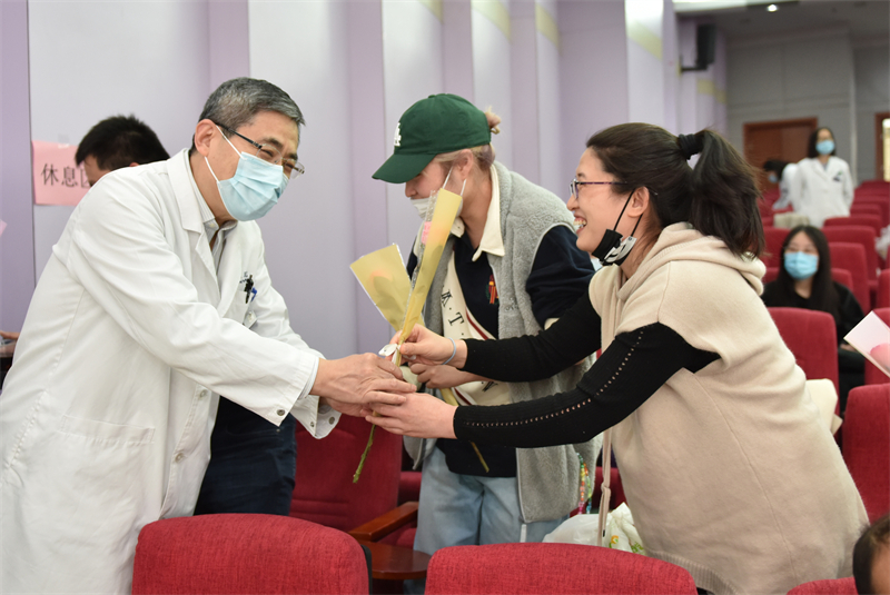 北医三院院长、党委副书记付卫,工会常务副主席刘温文来到献血活动现场,慰问献血的医务人员,为大家送上鲜花、食品、红糖水等,嘱咐他们好好休息,并感谢他们付出的热血和爱心。