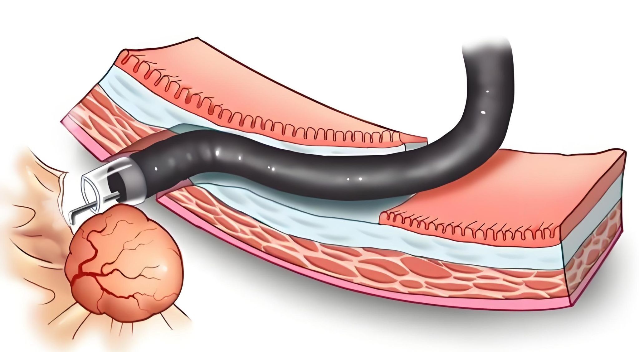 术中,张超团队通过内镜在食管黏膜下层建立“隧道”,于食管固有肌层切开仅大约1.5cm开口,以“最短路径”进入后纵膈,利用高清内镜视野逐层剥离与周围紧密粘连的肿物。操作全程既要精准分离病灶,又需确保周边重要血管、器官安全。