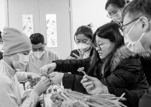 在活动现场的做手工环节中,志愿者朱盼盼(前排右二)手把手教一名患儿做手工。