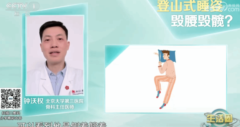 ——【CCTV1】3月18日《生活圈》栏目,近日,北医三院骨科主任医师钟沃权为大家科普了登山式睡姿毁腰毁髋。