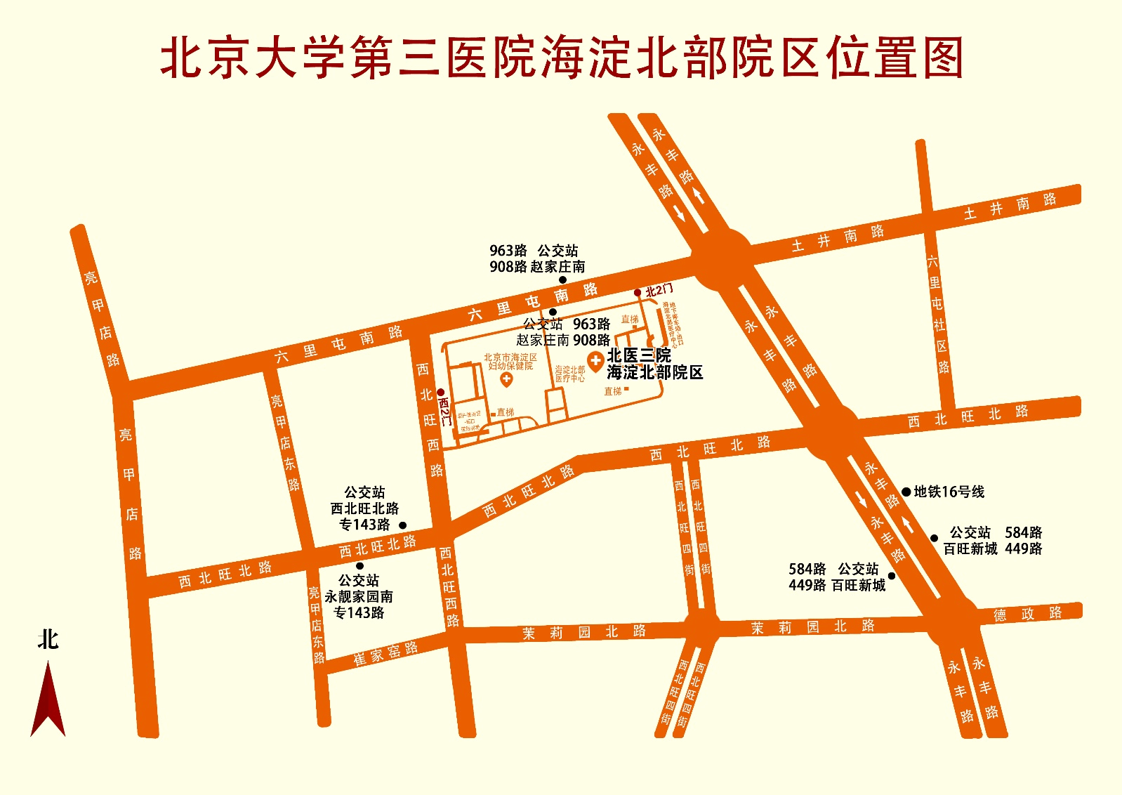 · Exit from Exit A of Northwest Wang Station (Subway Line 16), then walk approximately 1.4 kilometers to the hospital via navigation.