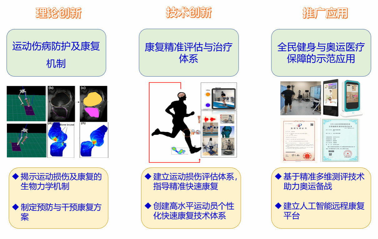 课题组历时15年,针对运动损伤的有效预防和功能康复进行系列研究,取得创新成果:阐明膝关节交叉韧带损伤的生物力学危险因素,创新性提出防护康复策略;揭示运动损伤后骨骼肌肉系统生物力学变化规律,制定干预方案并预防继发损伤;建立人工智能远程康复云平台、研发自主创新AI康复设备;基于结构愈合、功能评定,多维度构建运动损伤评估体系,指导精准康复方案制定;创建了韧带修复重建内减张和手术后外科加速康复技术,将康复理念运用到手术技术改进中,能够使手术后早期进行关节功能康复,明显提高临床效果。为解决运动员快速恢复竞技能力的重要需求,开展个性化序贯式康复治疗技术,确保运动员快速功能康复重返运动训练与比赛,为国家奥运争光。