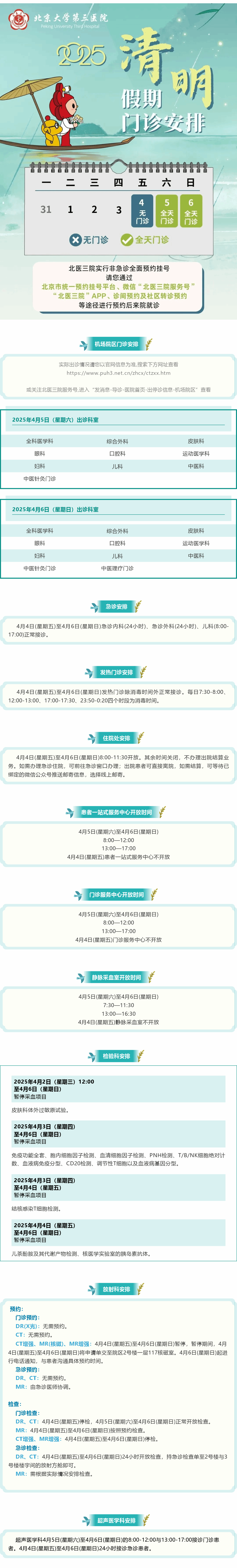 北医三院机场院区2025年清明假期安排