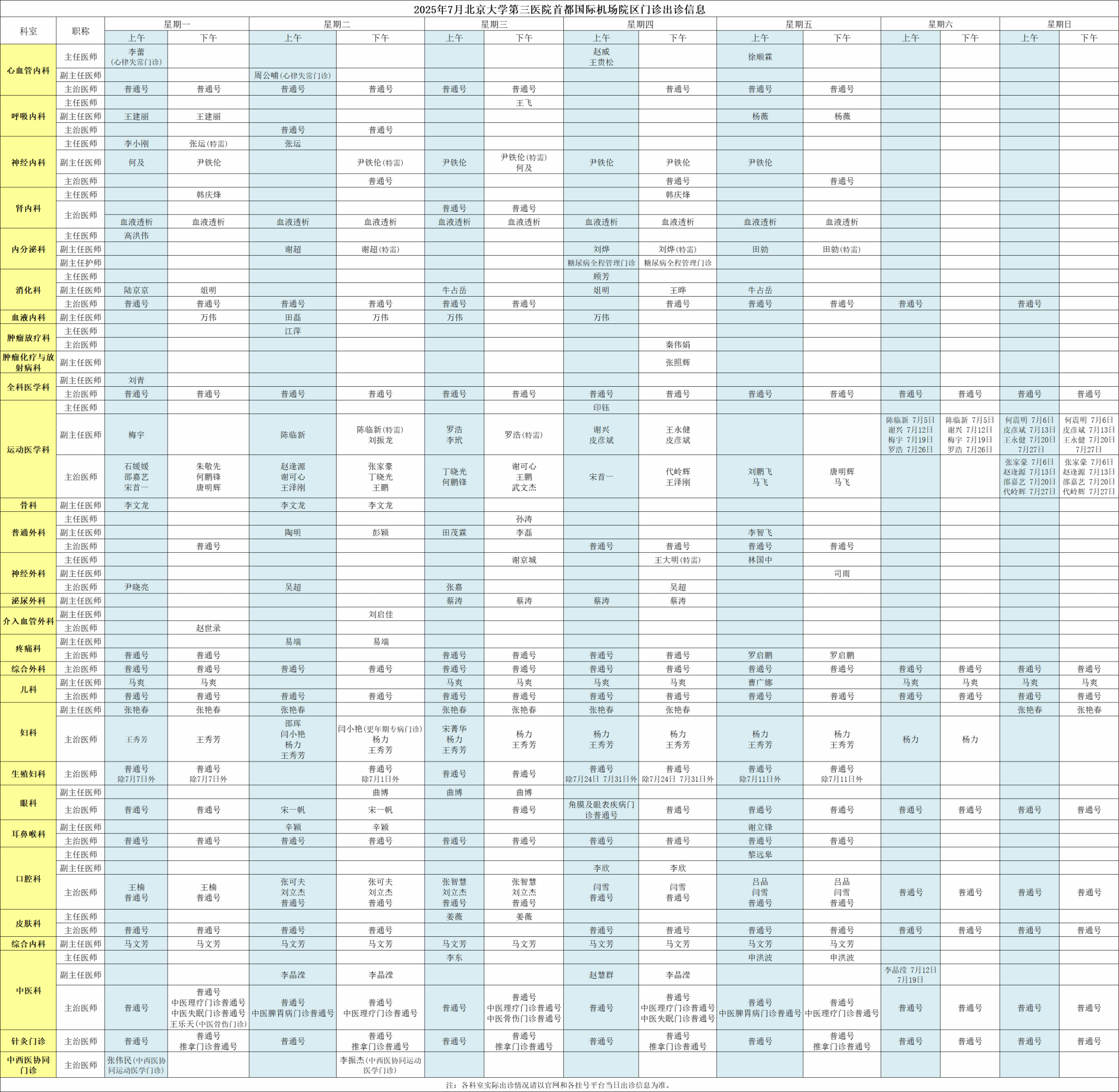 北医三院机场院区2025年7月门诊出诊信息