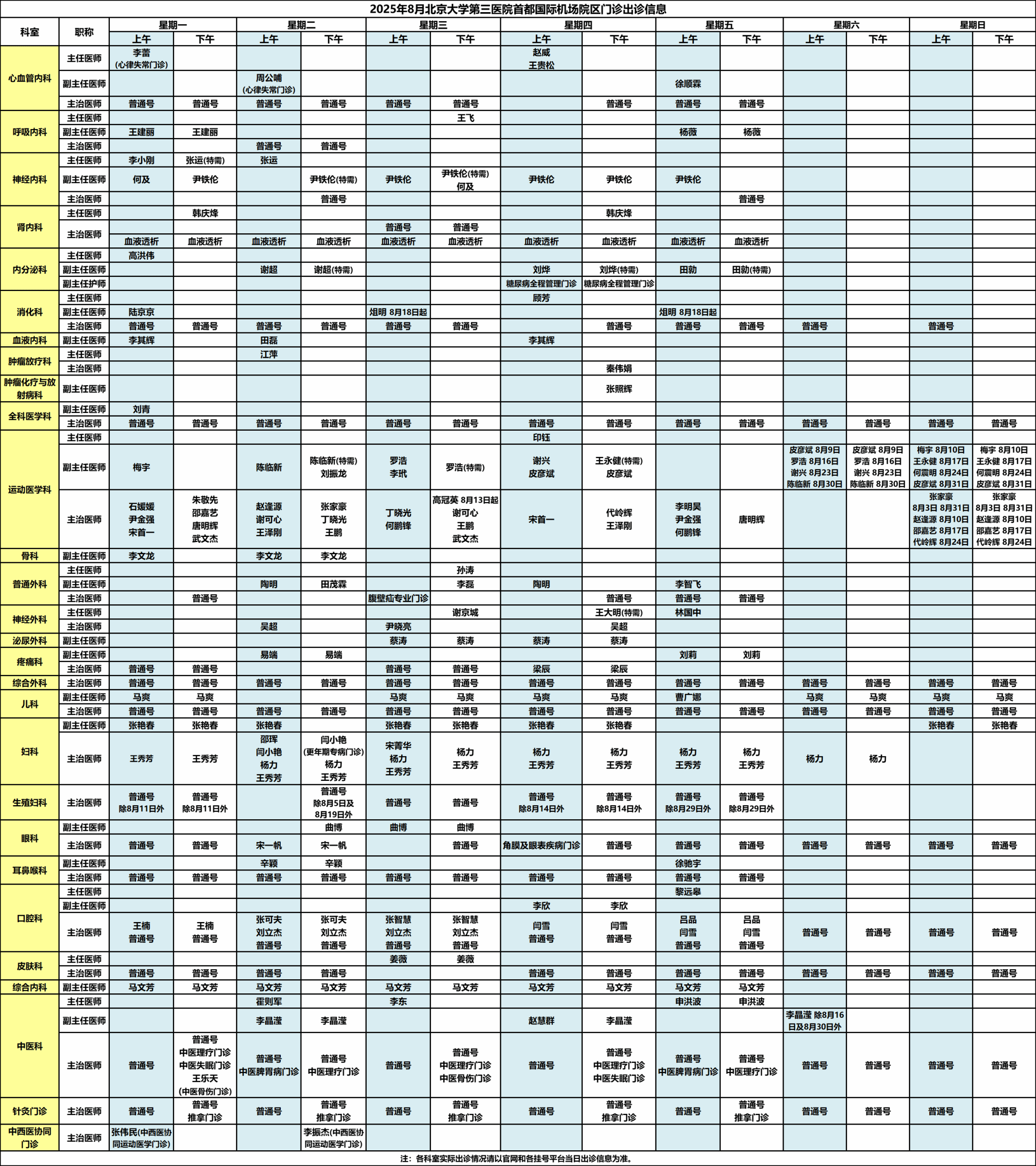 北医三院机场院区2025年8月门诊出诊信息