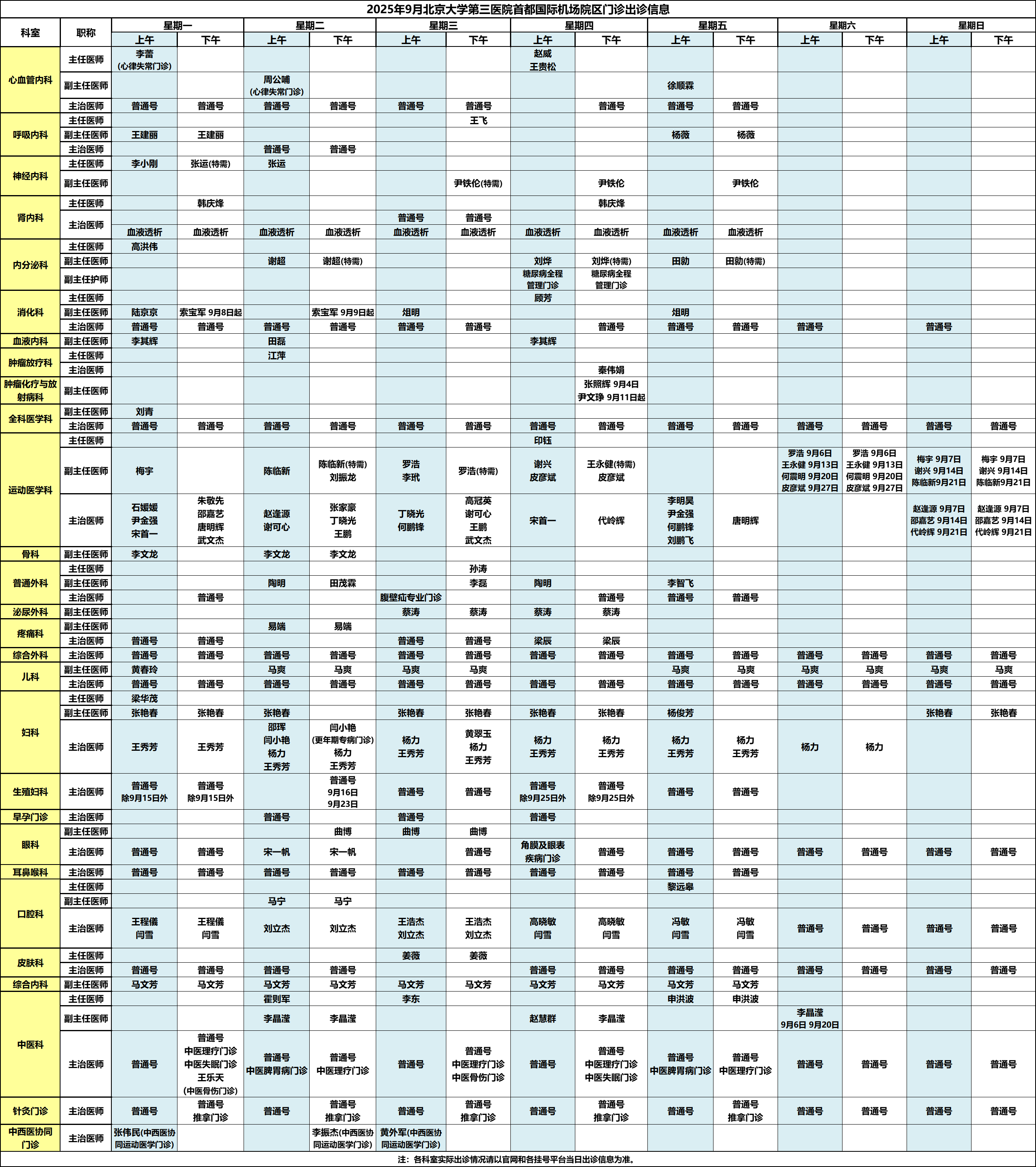 北医三院机场院区2025年9月门诊出诊信息