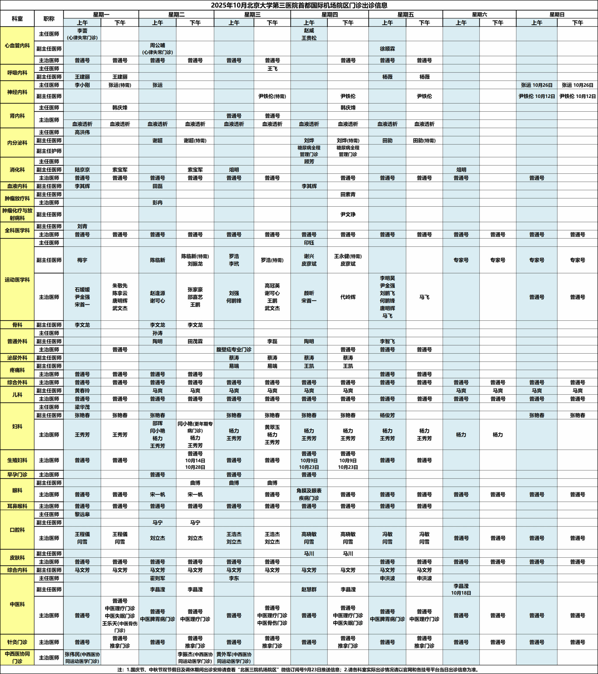 北医三院机场院区2025年10月门诊出诊信息