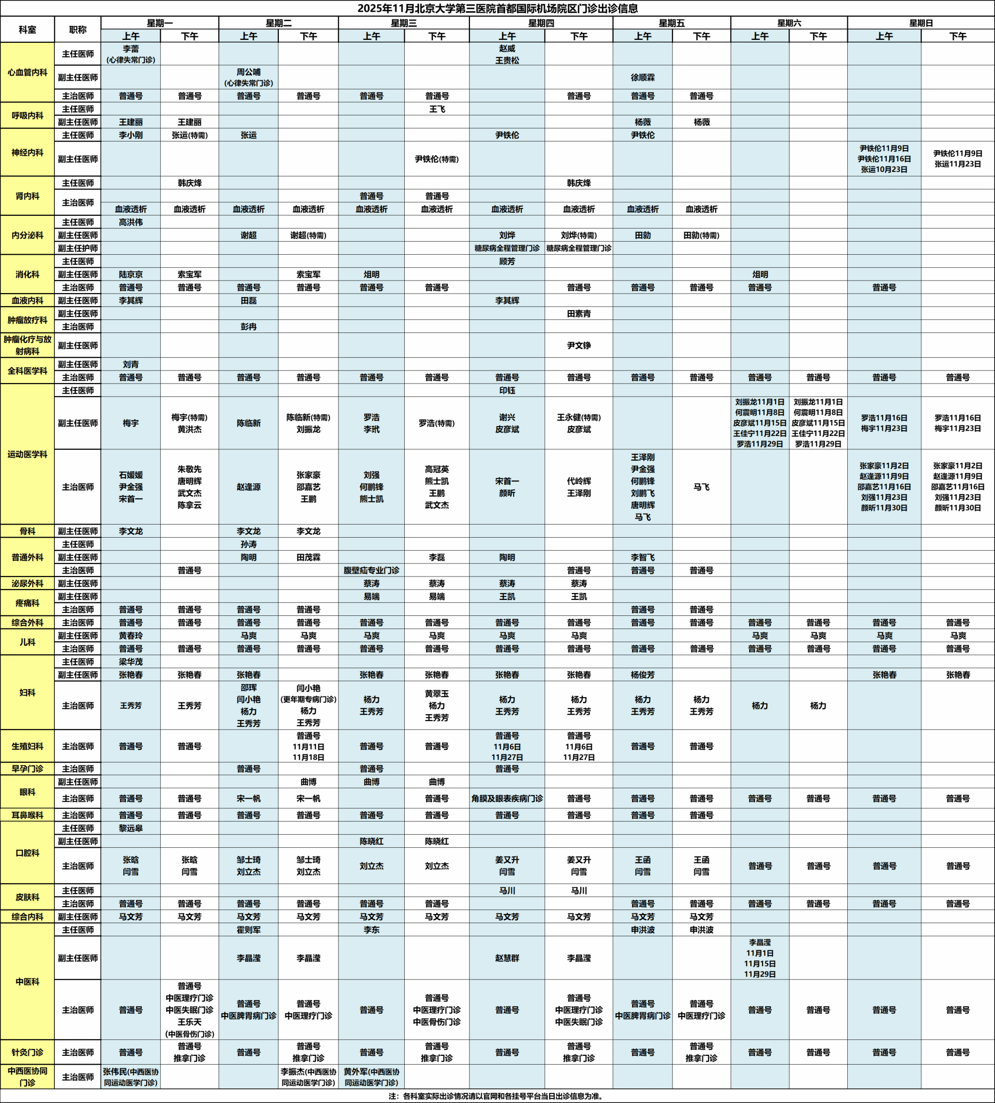 北医三院机场院区2025年11月门诊出诊信息