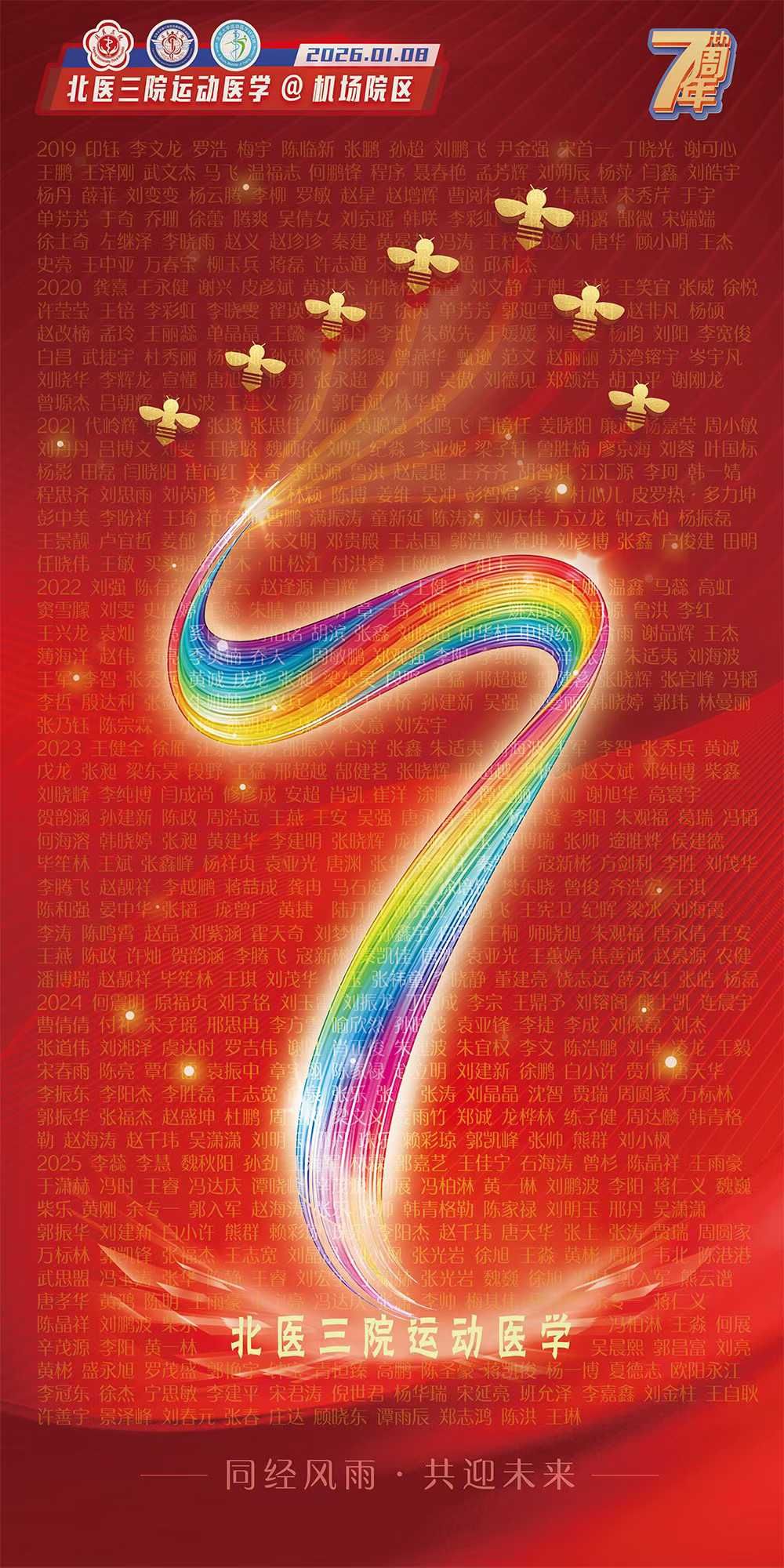 致敬这小蜜蜂群名单里的你们,你们的奋斗和努力是七周年的基石:致敬来自全国各地的运医人,你们和三院运医人一起建设院区;致敬运五、运六病房和综合二病房的所有同事们,你们的梯次加入让运医飞得更高!致敬每年新加入的院区医护人员们,是你们的活力和能量让运动医学医教研工作在院区同质化发展;致敬运四病房所有医护人员,七年的时光我们一起走过,你们是机场院区的骄傲!