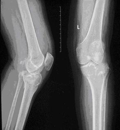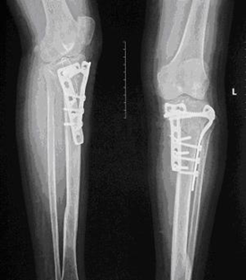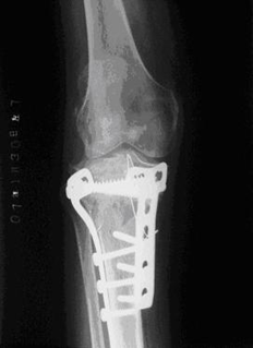 图1.一例左膝胫骨平台骨折 图2.内固定术后的X线片表现