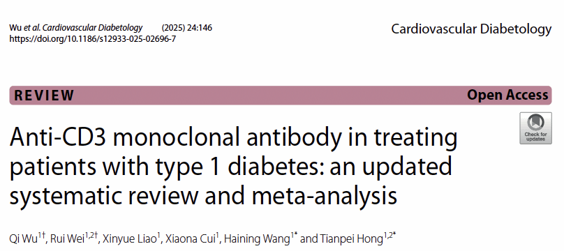 2025年4月,北京大学第三医院内分泌科洪天配/王海宁研究员团队在《Cardiovascular Diabetology》杂志(中科院一区,即时IF = 8.5)发表一篇题为《Anti-CD3 monoclonal antibody in treating patients with type 1 diabetes: an updated systematic review and meta-analysis》的系统评价和荟萃分析。博士研究生吴琪和研究员魏蕊为本文的共同第一作者。