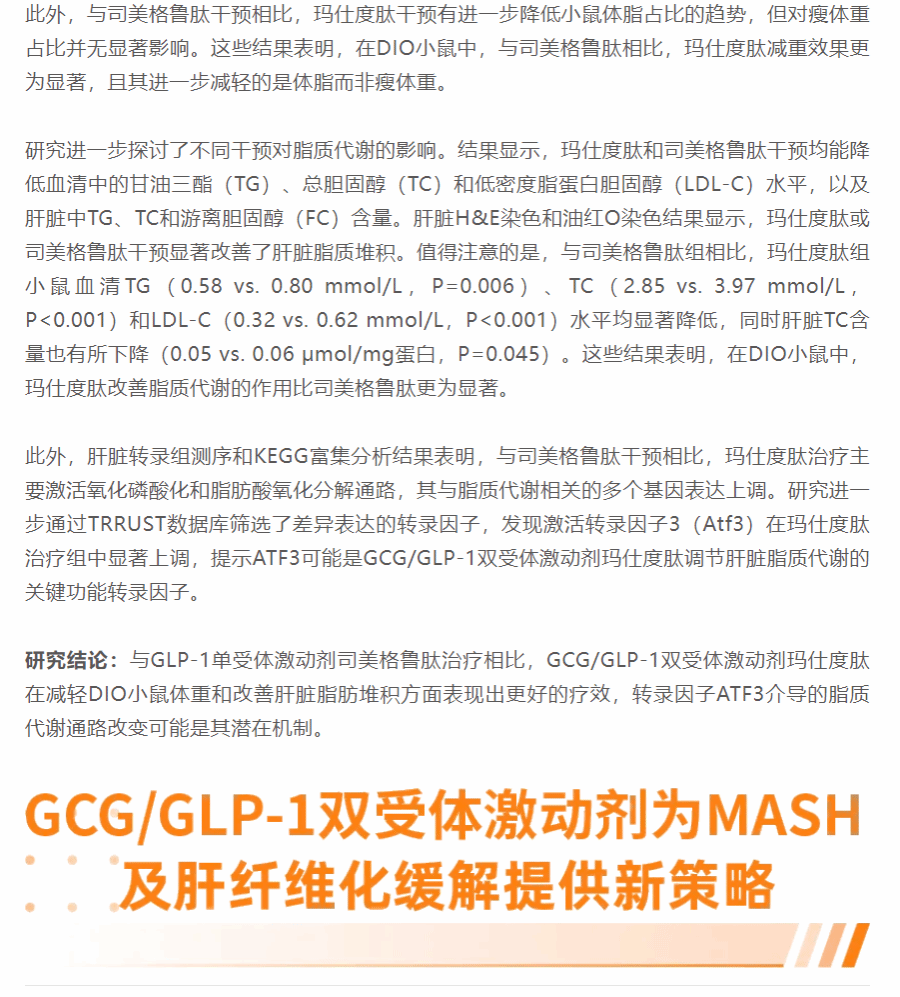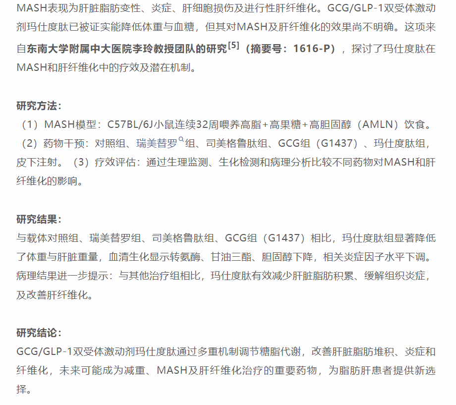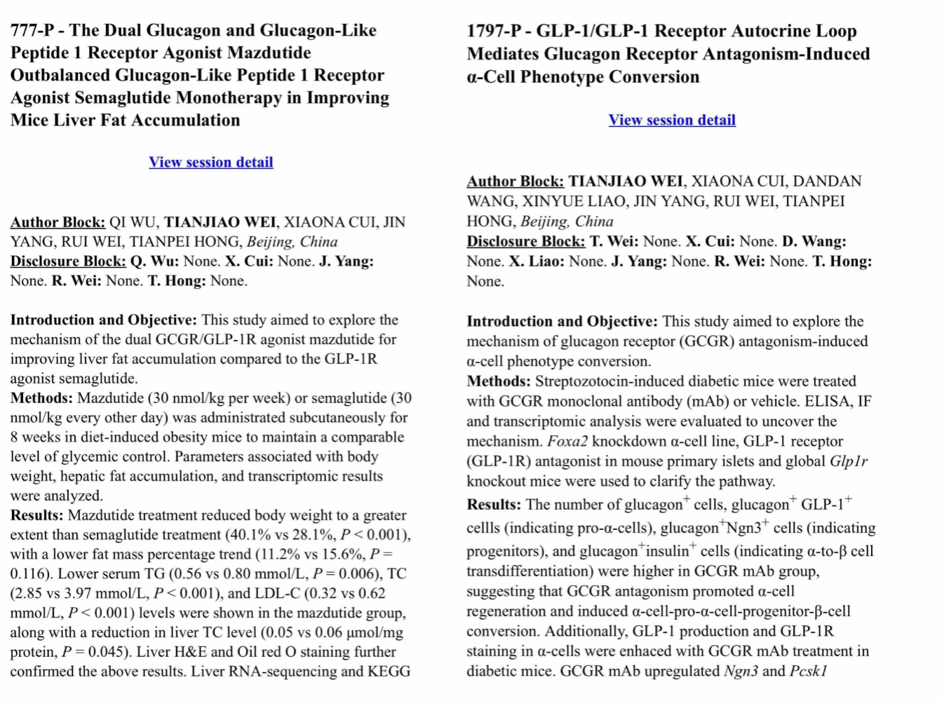 洪天配教授/魏蕊研究员团队的两项研究成果亮相。研究一《The Dual Glucagon and Glucagon-Like Peptide 1 Receptor Agonist Mazdutide Outbalanced Glucagon-Like Peptide 1 Receptor Agonist Semaglutide Monotherapy in Improving Mouse Liver Fat Accumulation》显示,胰高糖素/GLP-1双受体激动剂玛仕度肽改善小鼠肝脏脂肪堆积作用优于GLP-1单受体激动剂司美格鲁肽。研究二《GLP-1/GLP-1 Receptor Autocrine Loop Mediates Glucagon Receptor Antagonism-Induced α-Cell Phenotype Conversion》显示,GLP-1/GLP-1受体自分泌环路介导胰高糖素受体阻滞诱导的α细胞表型转换。