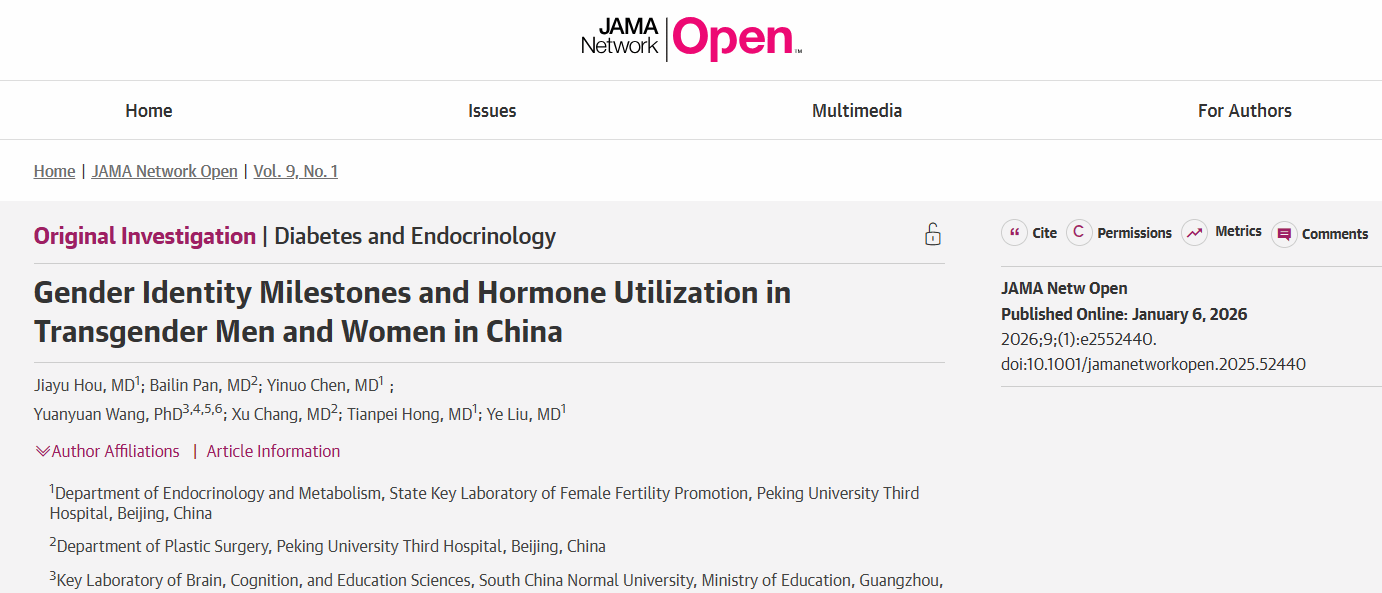 2026年1月6日,北京大学第三医院性别医学团队在权威期刊JAMA杂志子刊JAMA Network Open上发表题为“Gender Identity Milestones and Hormone Utilization in Transgender Men and Women in China”的研究成果,该研究分析了中国跨性别人群的性别认同发育历程和性别肯定激素疗法相关药物的应用情况(图1)。