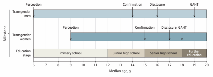 图2. 中国跨性别男性和女性的性心理发育历程和性别肯定激素疗法(GAHT)首次使用年龄