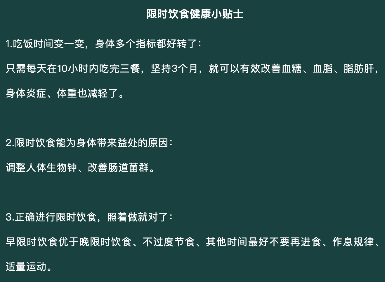 健康小贴士:可根据自身实际情况调整进食时间,只要保证在10小时内吃完三餐即可。