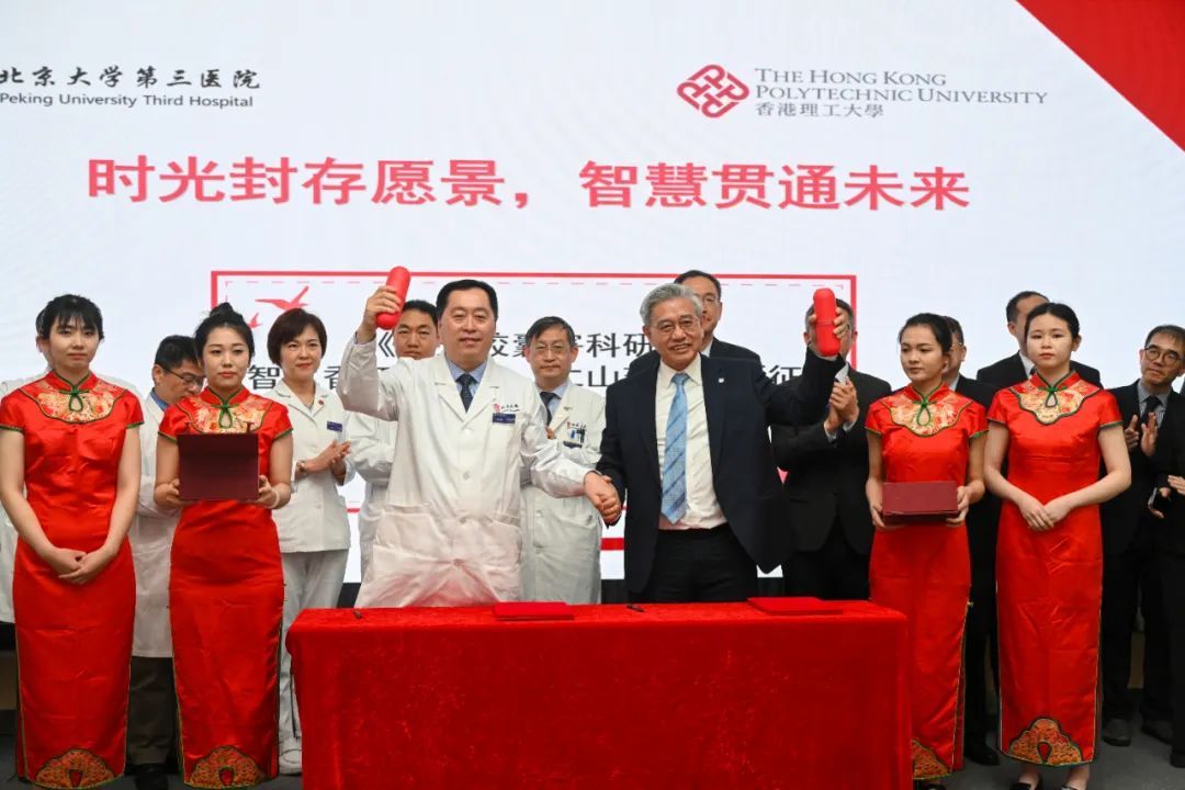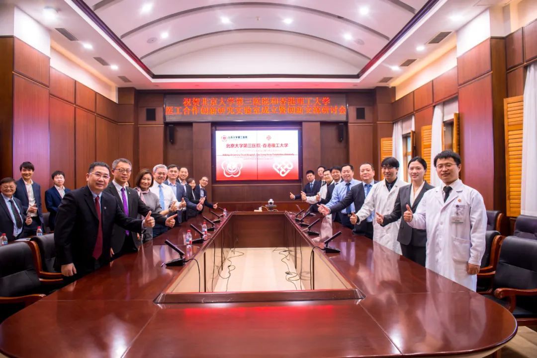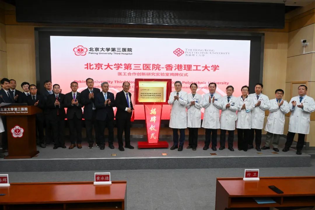 在推进国家医学与工程学科交叉融合的战略框架下,北京大学第三医院(北医三院)与香港理工大学(港理大)以人工智能与大数据技术为引擎,聚焦智能诊疗与精准医疗,携手构建“临床需求-技术研发”协同创新体系。双方继2025年1月签署战略合作备忘录后,于4月17日在北京举行"医工合作创新研究实验室"揭牌仪式,标志着京港两所顶尖高校在跨学科领域的合作携手并进,联动超驰。北医三院院长付卫教授与港理大常务及学务副校长黄永德教授共同为联合研究实验室揭牌。工程学院院长文効忠教授、北医三院副院长沈宁教授、普通外科主任原春辉教授、吴琼女士、中心和实验室主任薛丽香教授、港理大生物医学工程学系系主任张明教授、医疗科技及资讯学系系主任蔡璟教授、生物医学工程学系副系主任杨莫教授、电机及电子工程学系副系主任卢家航教授、电机及电子工程学系陈锐霖副教授、电机及电子工程学系罗毅芳副教授、专业及持续教育学院工程及健康学部实务教授(健康科)和学部副主任方玉辉教授、工业及系统工程学系李明助理教授、工业及系统工程学系高级专任导师邓育明博士、工业及系统工程学系杨立冬助理教授、港理大其他工作人员以及北医三院医务处副处长吴昕霞副研究员与徐昕晔教授、党院办副主任王剑副研究员、普通外科核心组孙涛教授、王行雁教授、马朝来教授、王港教授、王亮教授、周玉洁主任护师以及普通外科李磊教授、张志鹏教授、邴运韬教授、陶明教授、王冰炎教授、孙巧玲护士长、裴琛护士长、李宁护士长、党院办陈雪瑶助理研究员及李曼助理研究员,以及普通外科的医生代表、护士代表、研究生代表共同见证了这一历史时刻。